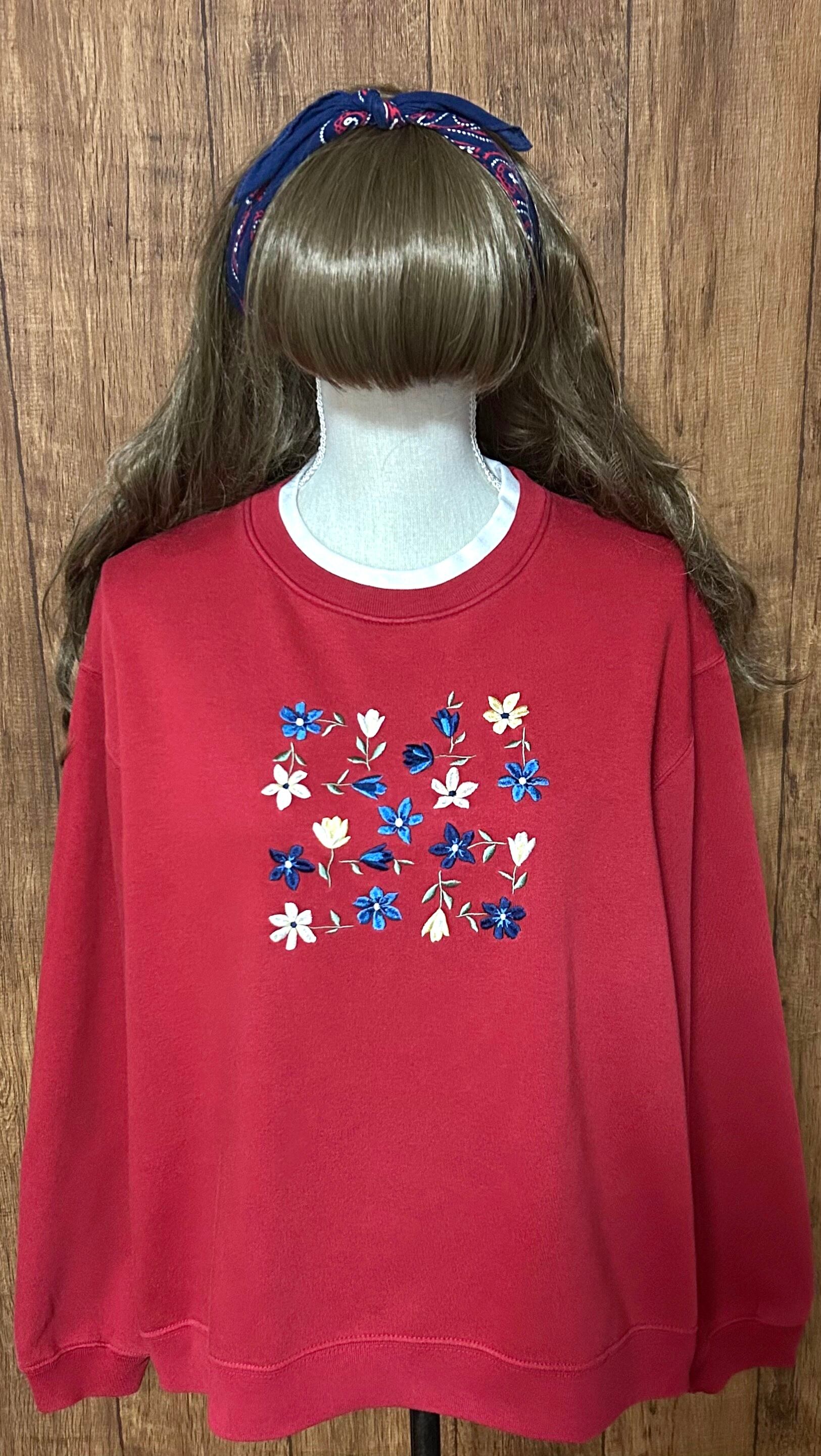 刺繍 スウェット スエット トレーナー 花 赤 二重襟 レトロ カラフル カントリー ファンシー おしゃれ 個性的 かわいい ヴィンテージ USA vintage used 古着/club723 クラブ723(N704)