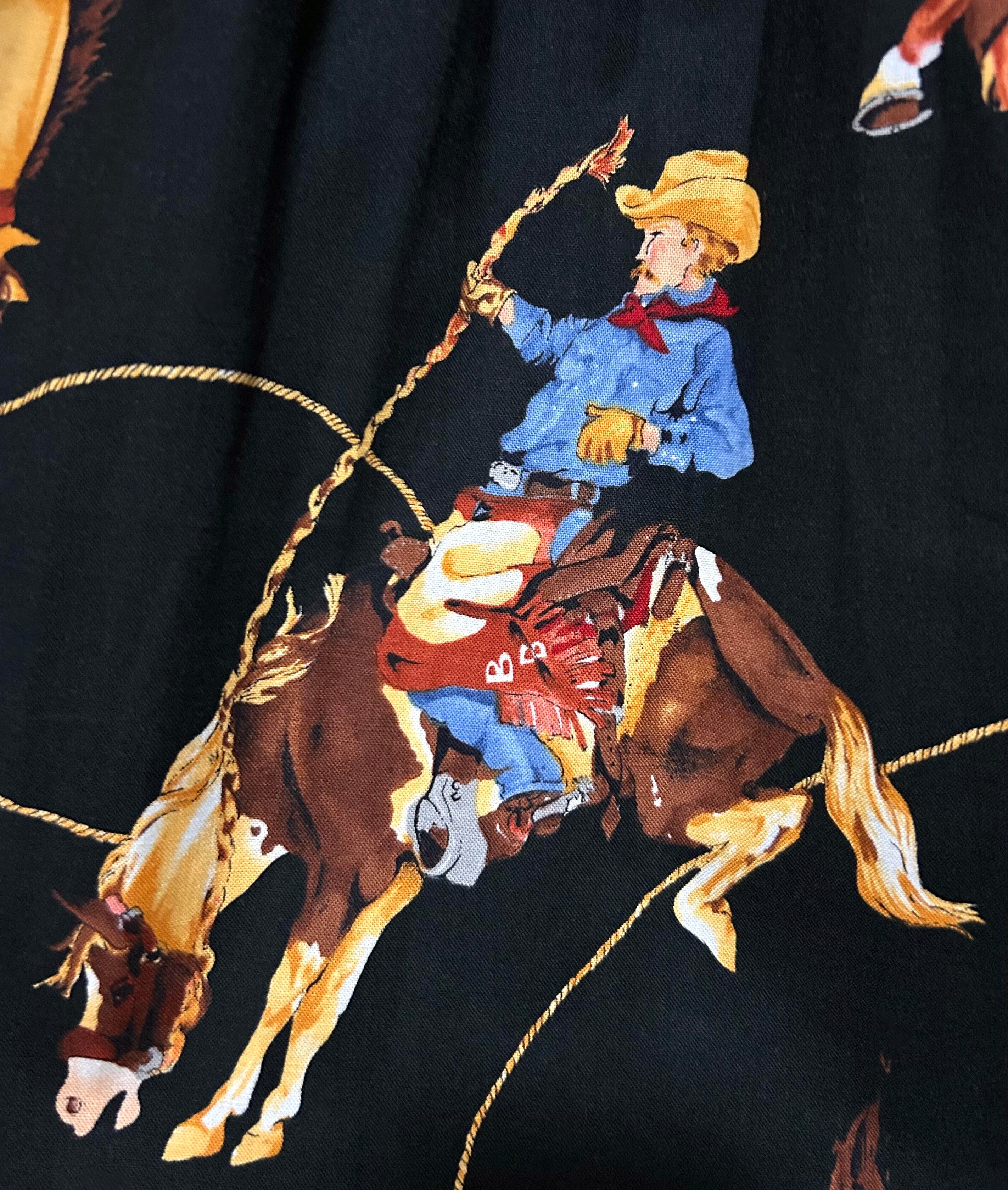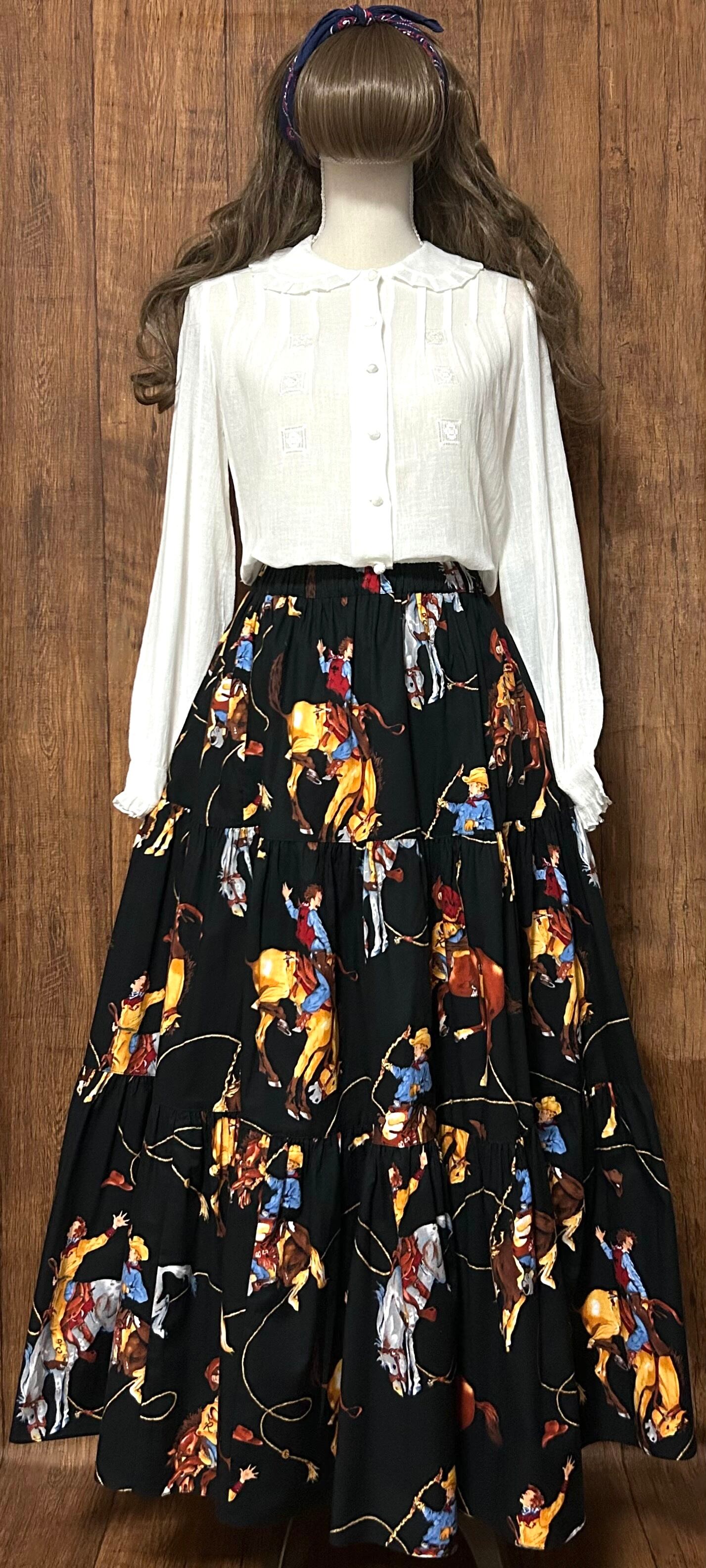 ヴィンテージ ティアード ロング スカート 馬 動物 黒 ボリューム ゴム ウエスタン カウボーイ ロデオ 人 USA 古着/club723 クラブ723(N711)