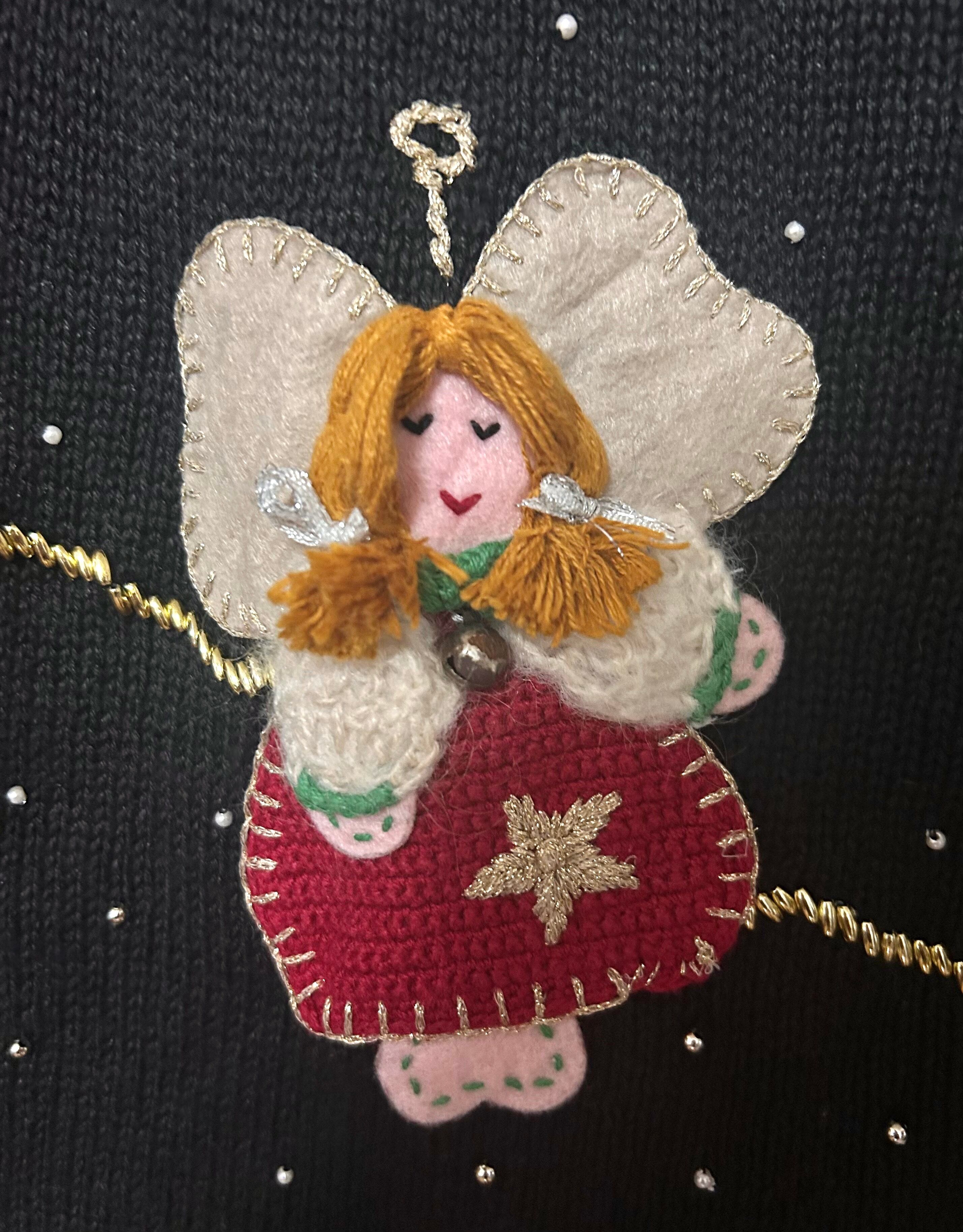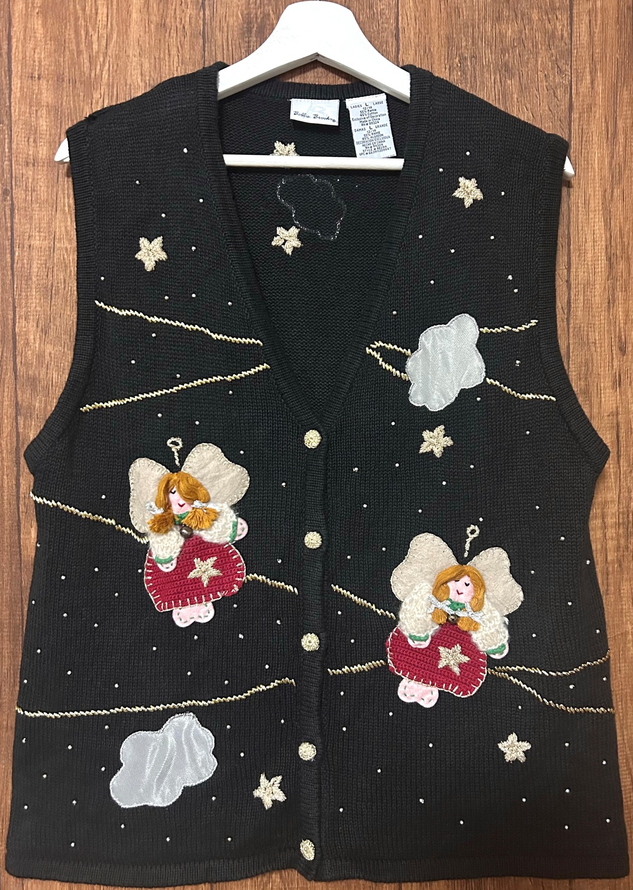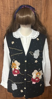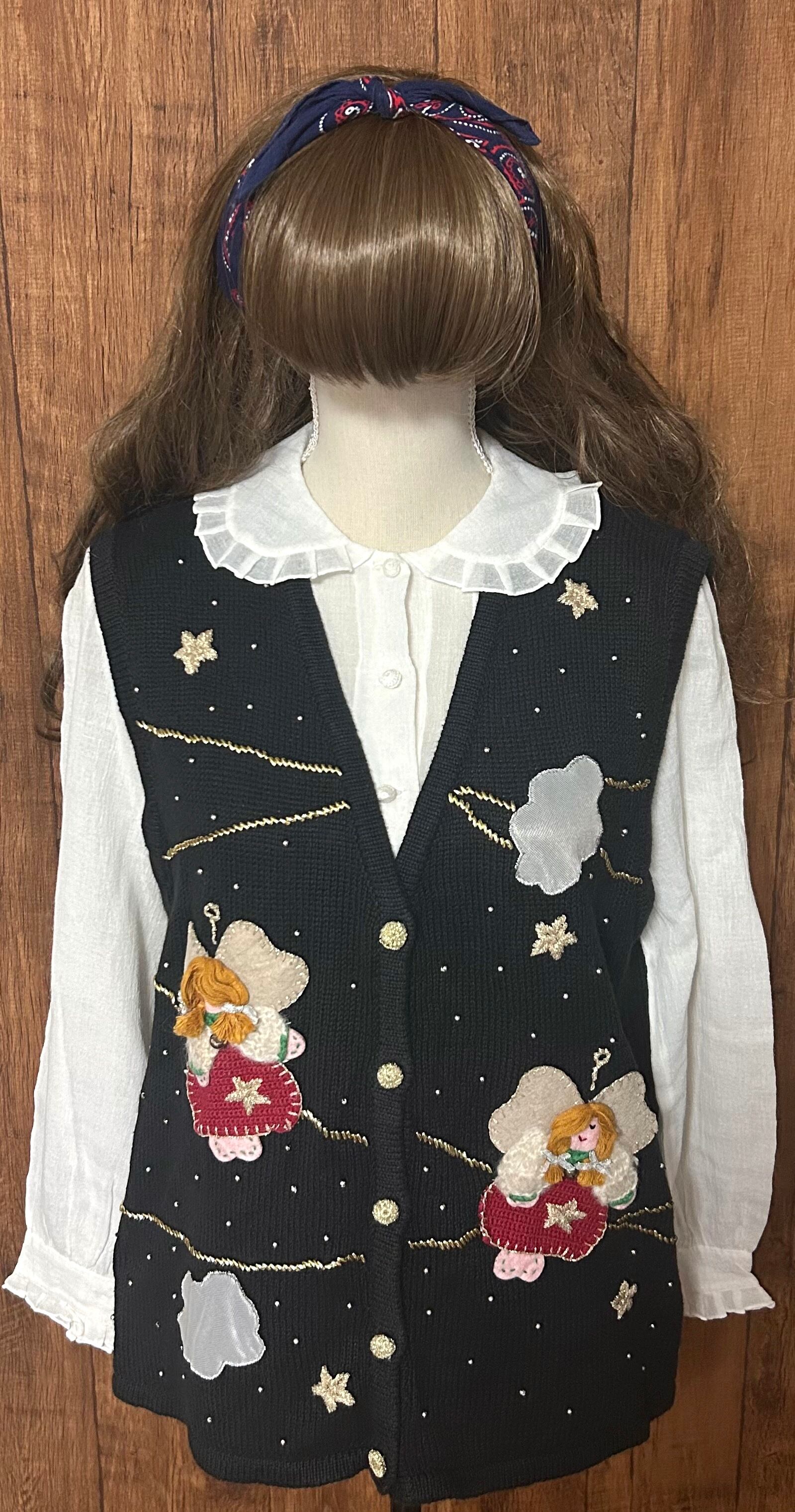 天使 エンジェル 女の子 ニットベスト 黒 刺繍 装飾 星 雲 人 ファンシー レトロ 個性的 かわいい おしゃれ ヴィンテージ USA vintage used 古着/club723 クラブ723(N726)