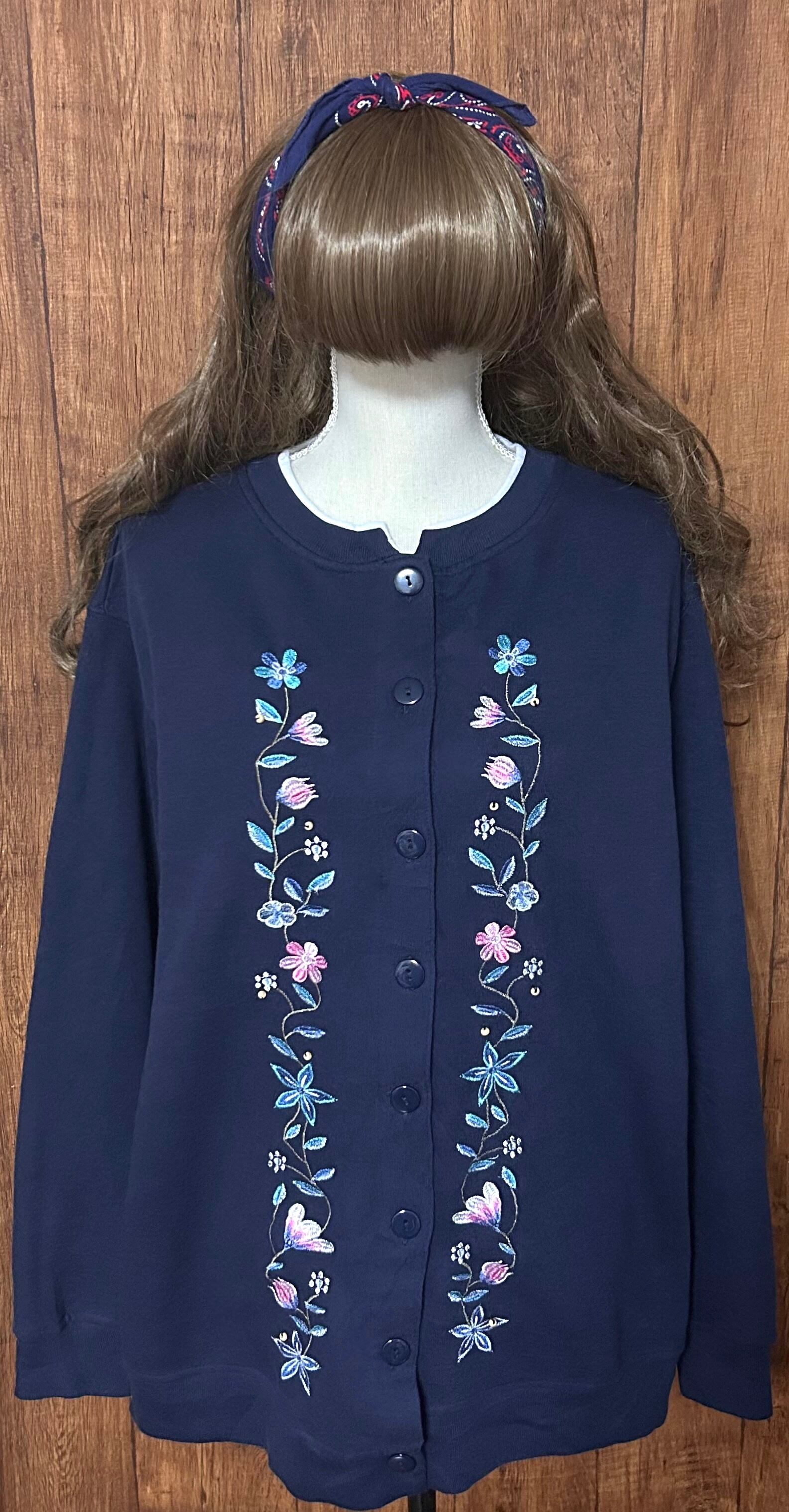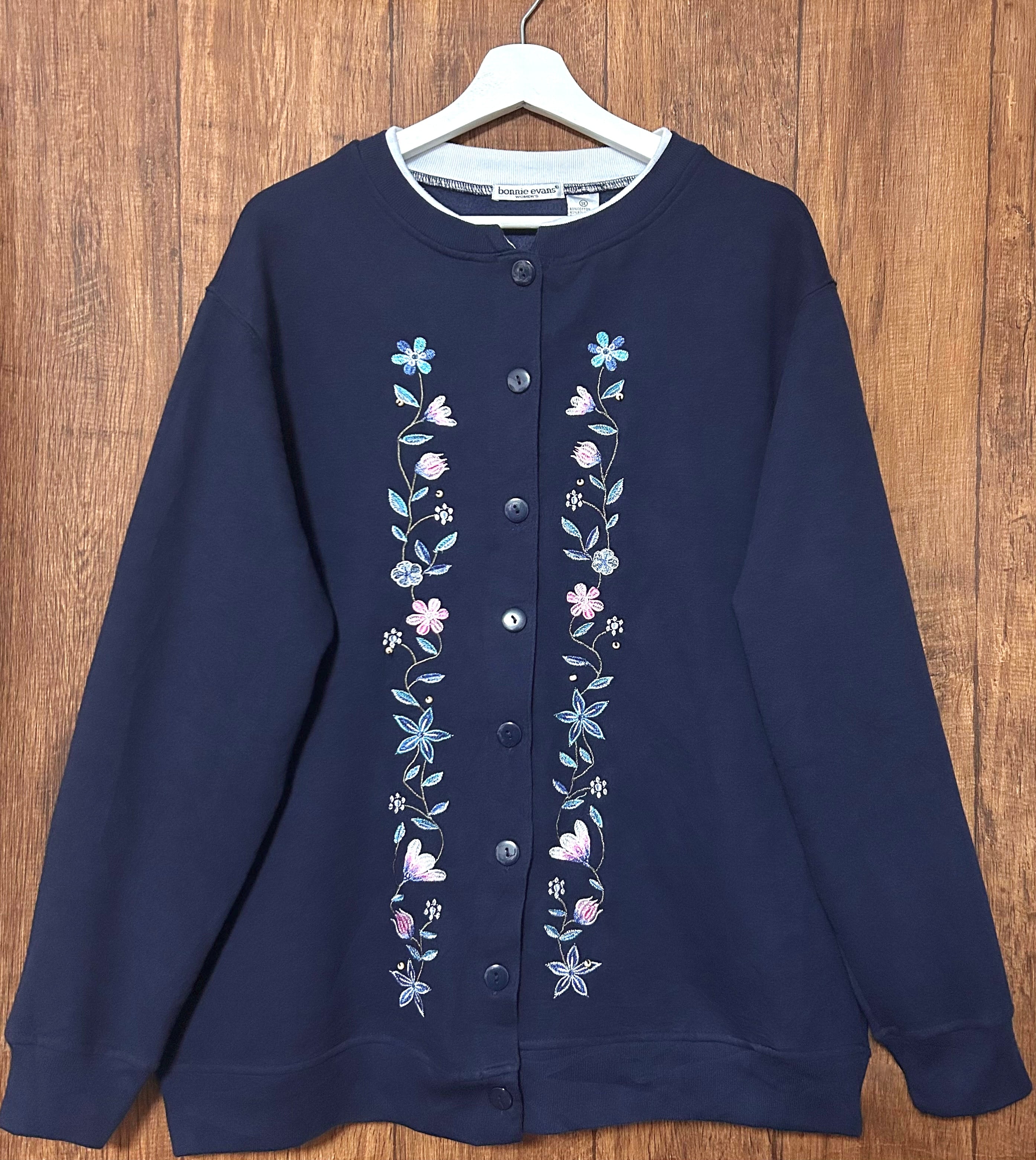 刺繍 スウェット スエット カーディガン カーデ 花 紺 ネイビー レトロ カントリー ガーリー ファンシー おしゃれ 個性的 かわいい ヴィンテージ USA vintage used 古着/club723 クラブ723(N727)