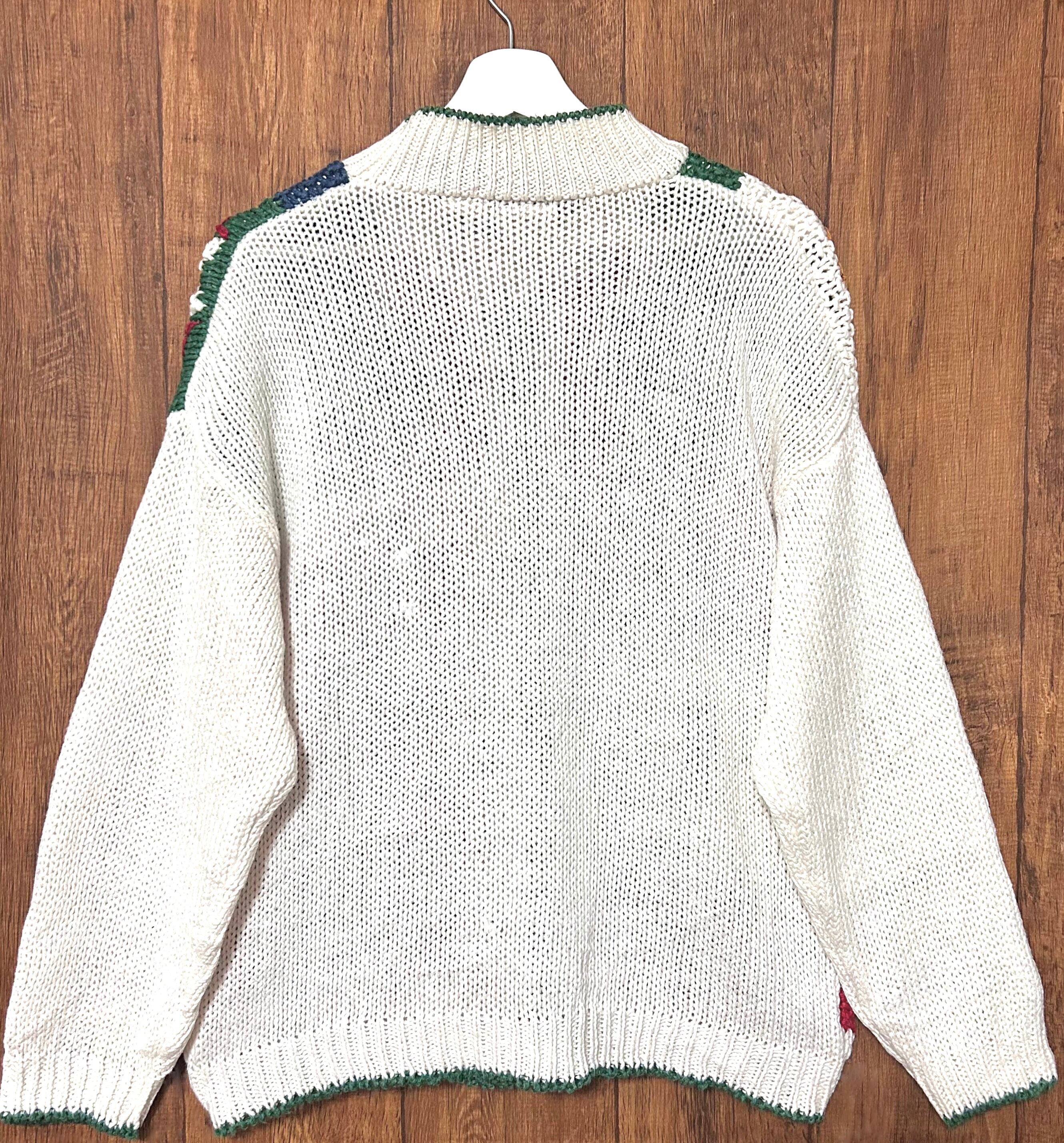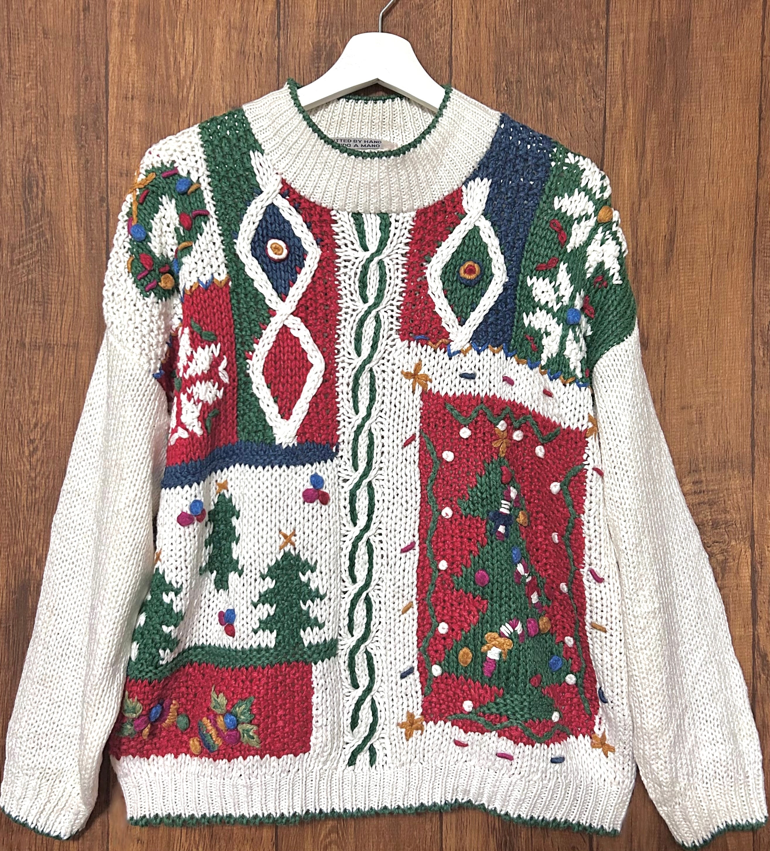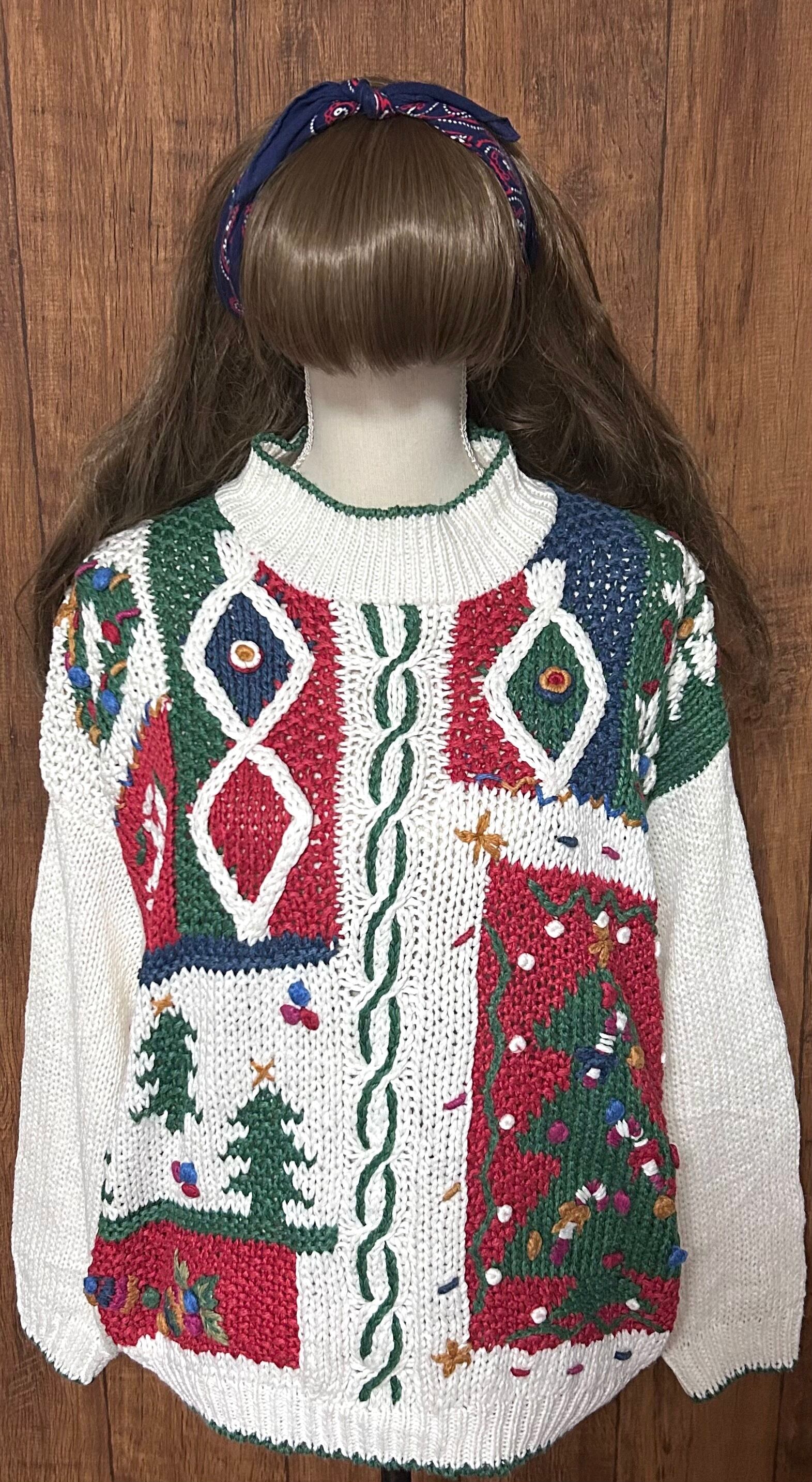 クリスマス アグリー セーター ニット 白 装飾 ツリー リース 雪 冬 レトロ カントリー ファンシー かわいい 個性的 ヴィンテージ USA vintage used 古着/club723 クラブ723(N731)