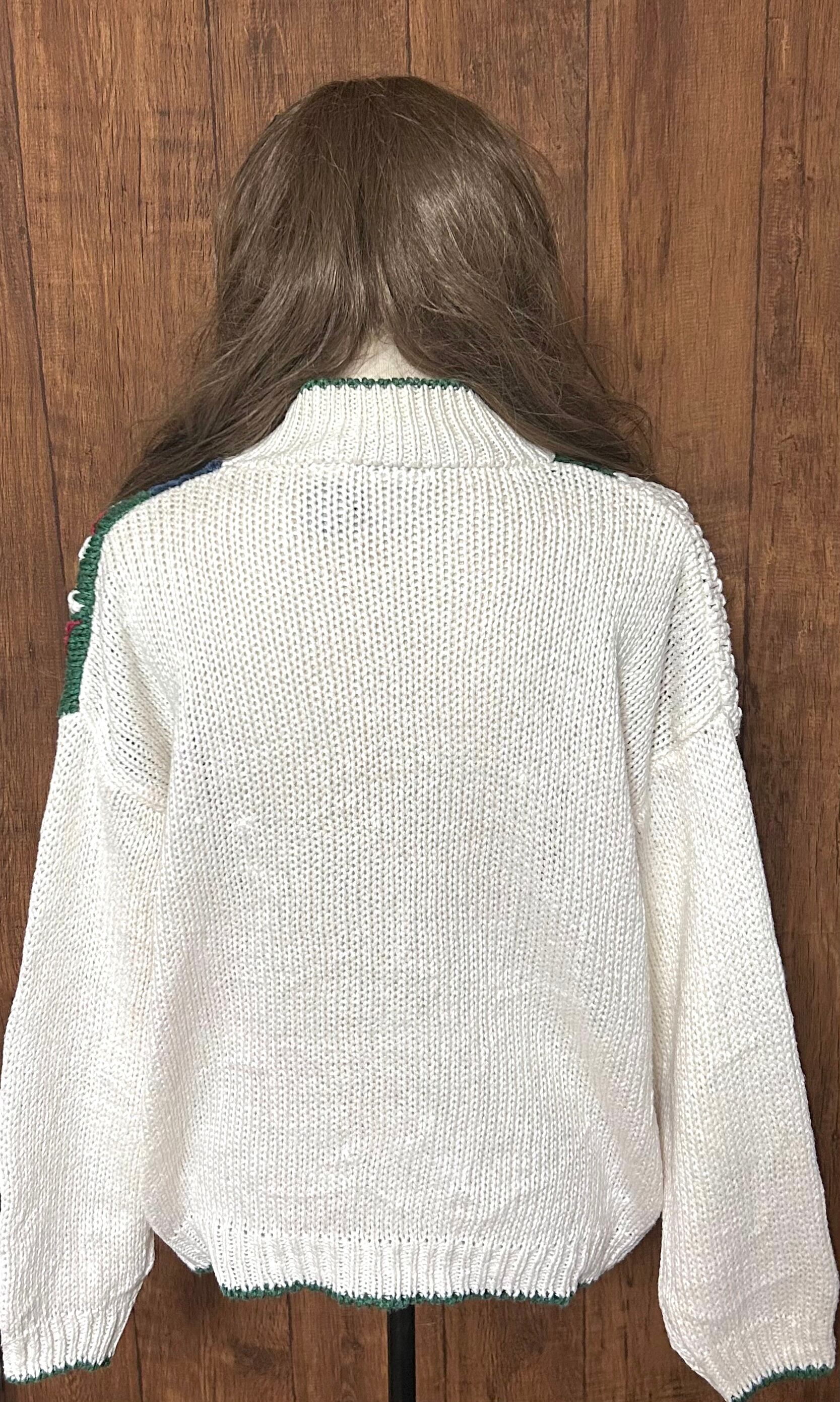 白地にクリスマス感いっぱいの装飾が施された華やかなクリスマスセーター。