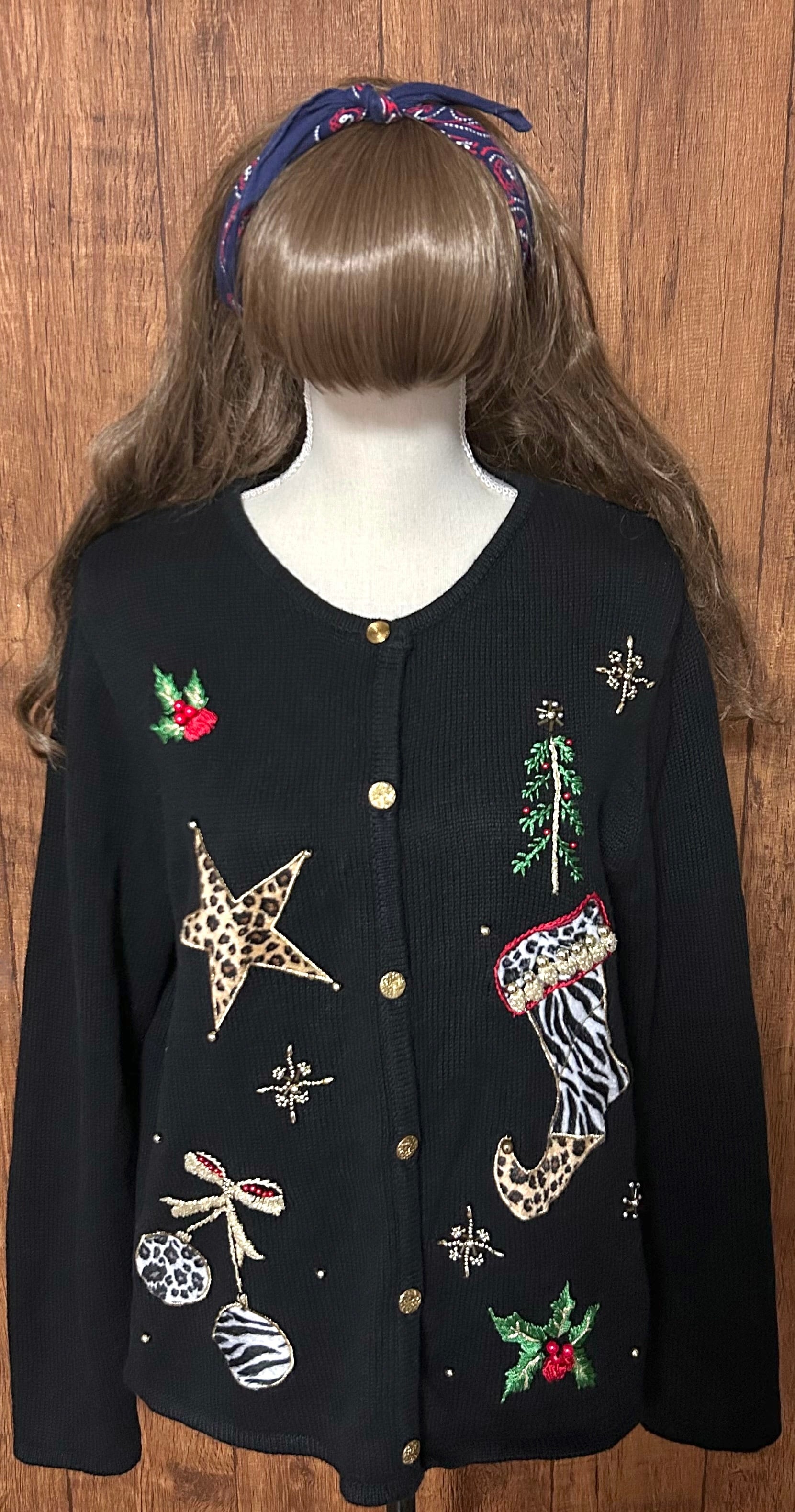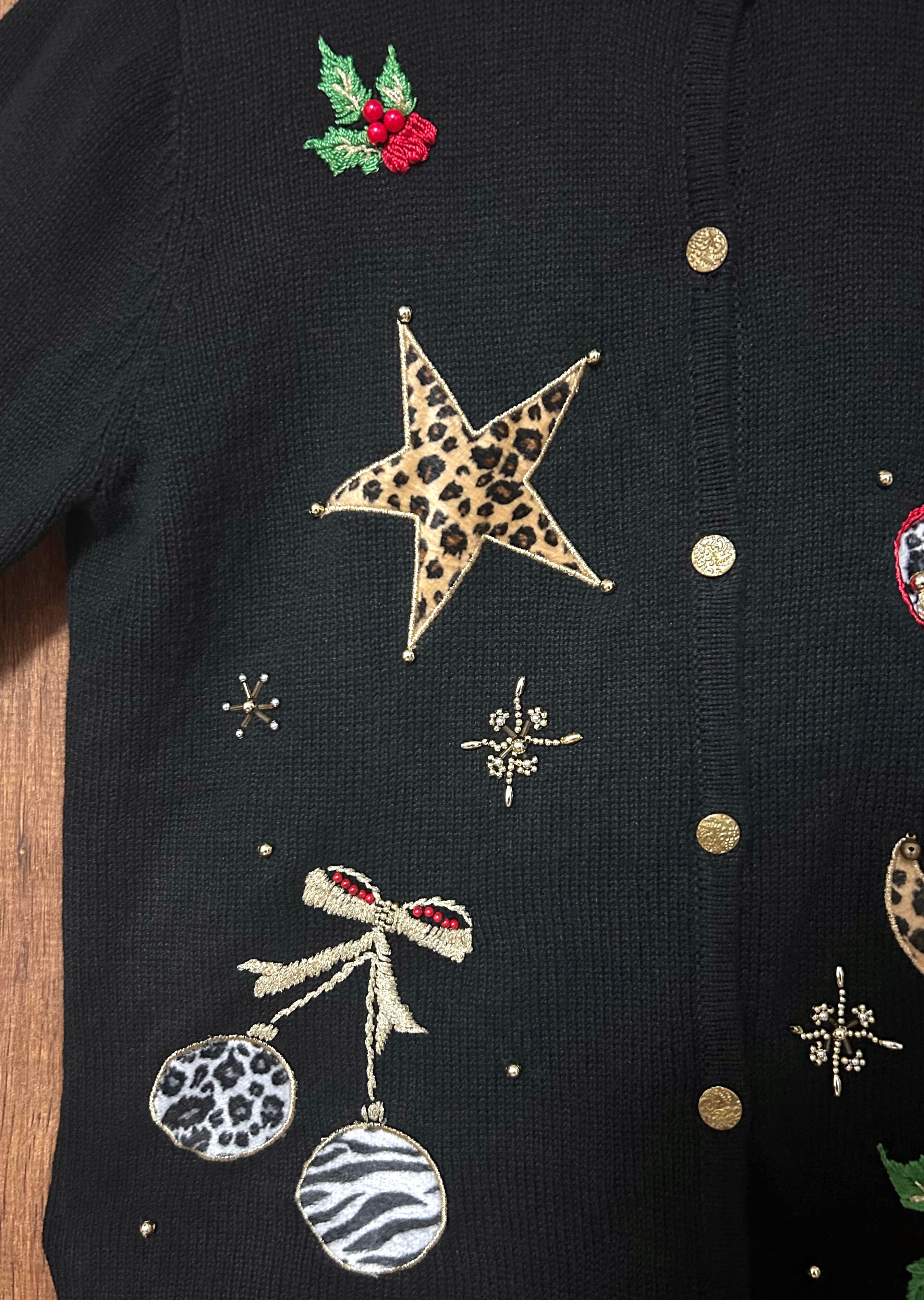 クリスマス ニット カーディガン カーデ 黒 刺繍 装飾 星 くつ下 ヒョウ柄 アニマル柄 ファンシー レトロ カントリー おしゃれ かわいい ヴィンテージ vintage used 古着/club723 クラブ723(N744)