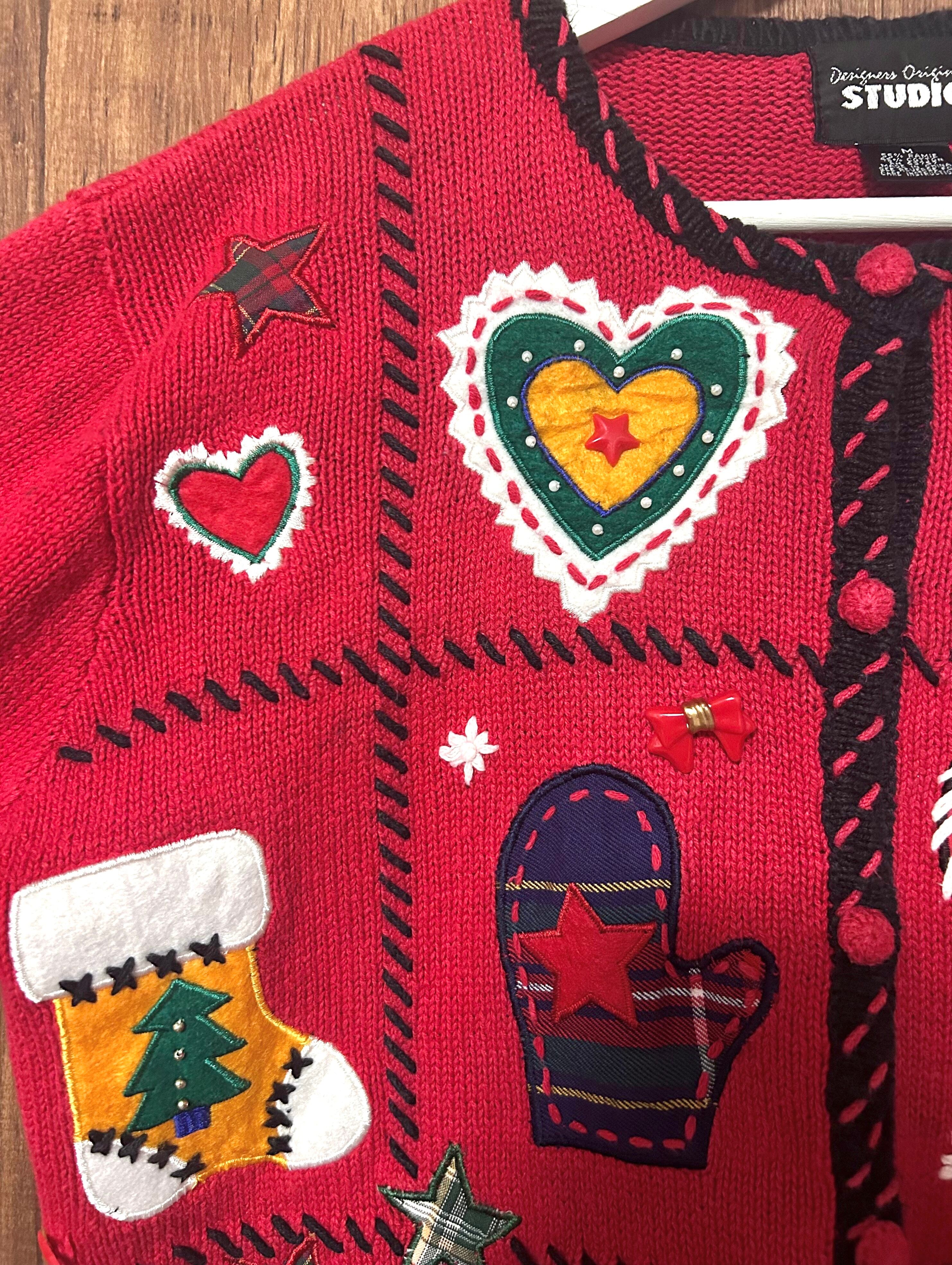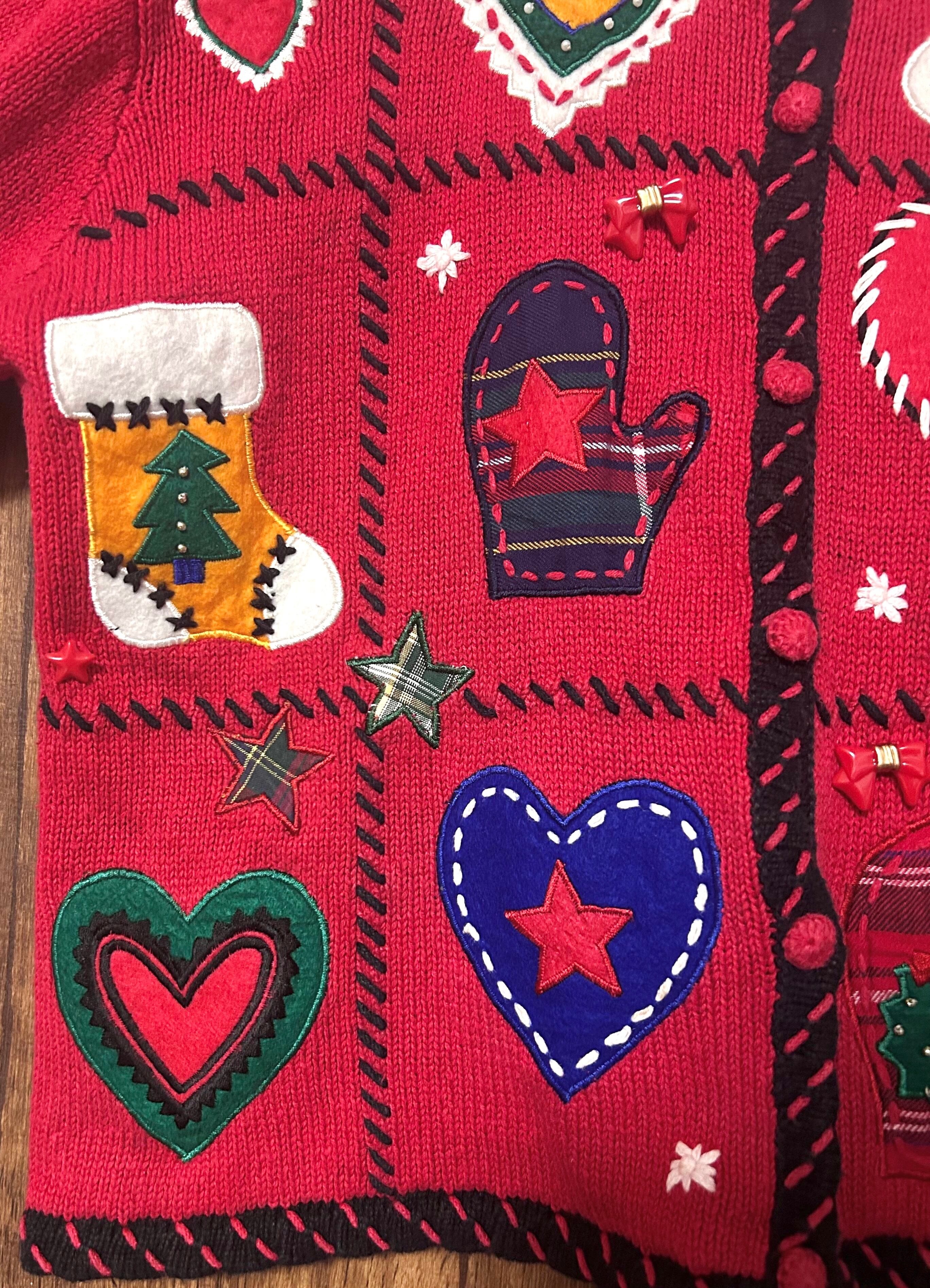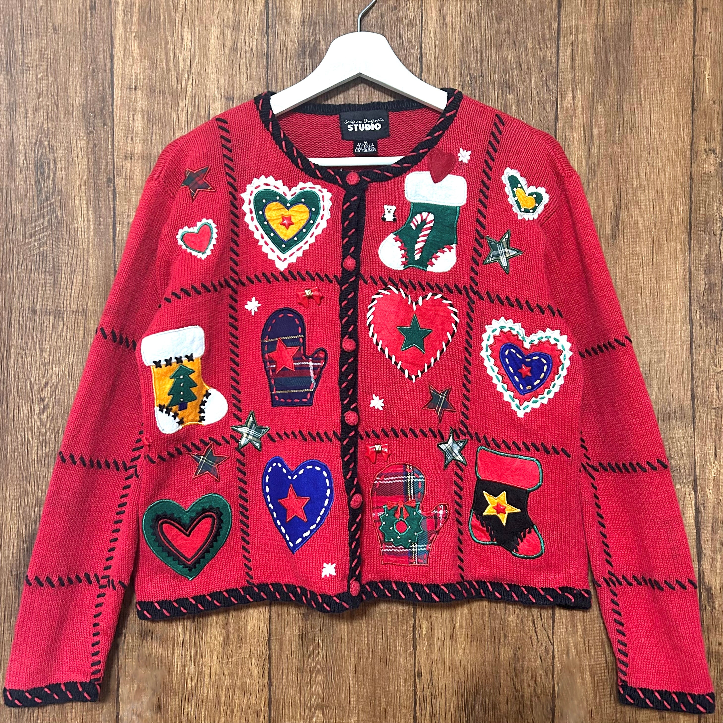 クリスマス アグリー ニット カーディガン カーデ 刺繍 装飾 くま リボン ハート 星 くつ下 ヴィンテージ カラフル ファンシー カントリー かわいい vintage used 古着/club723 クラブ723(N746)