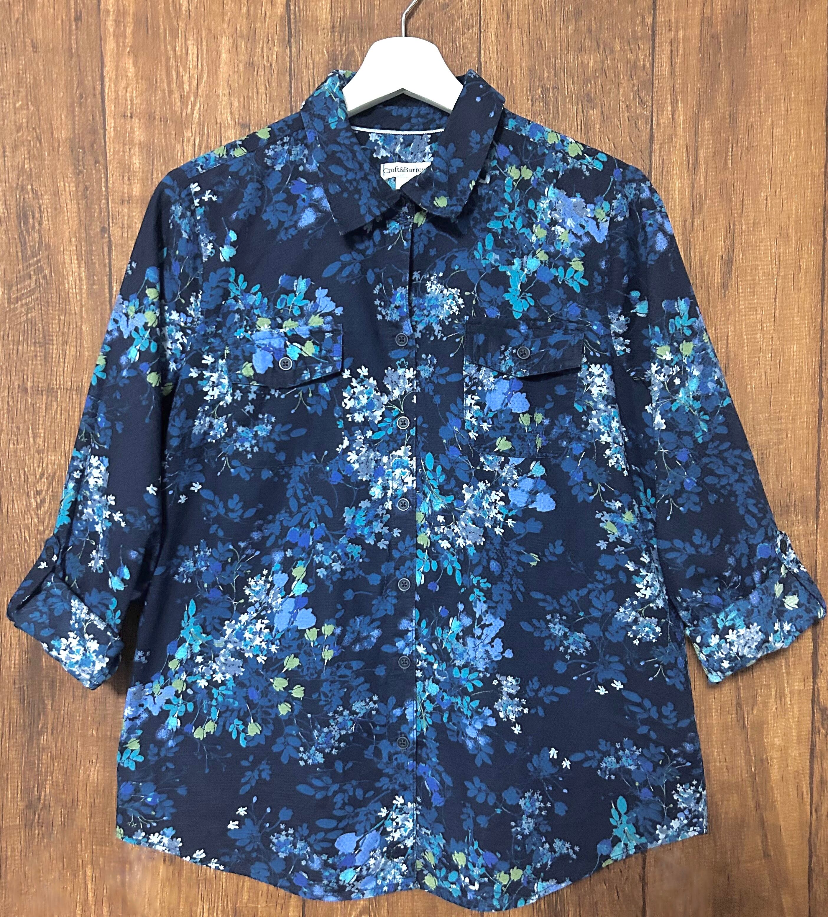 花柄 総柄 シャツ 長袖 七分 胸ポケット 紺 ネイビー カラフル レトロ カントリー ガーリー おしゃれ かわいい 個性的 ヴィンテージ used vintage USA 古着/club723 クラブ723(N766)