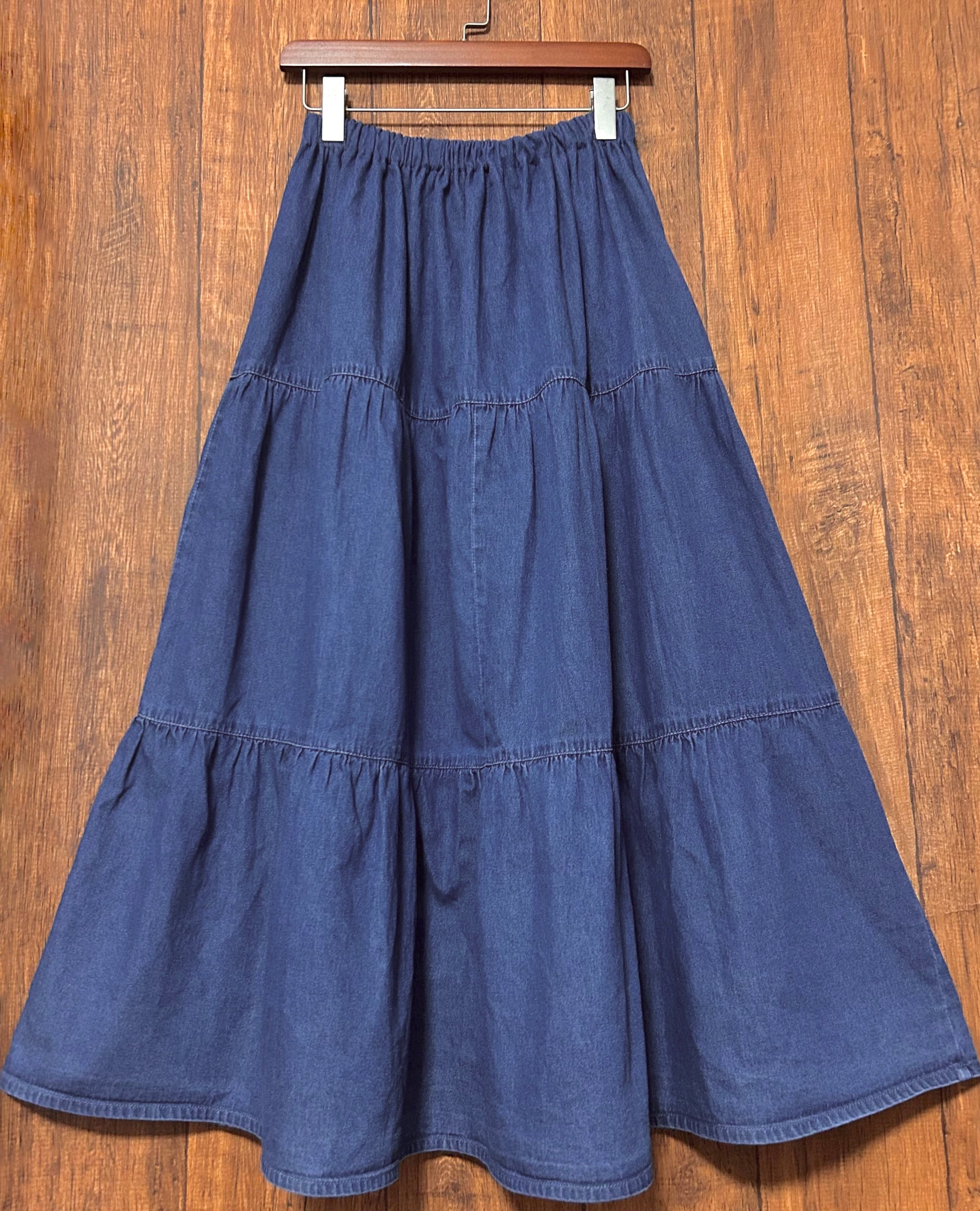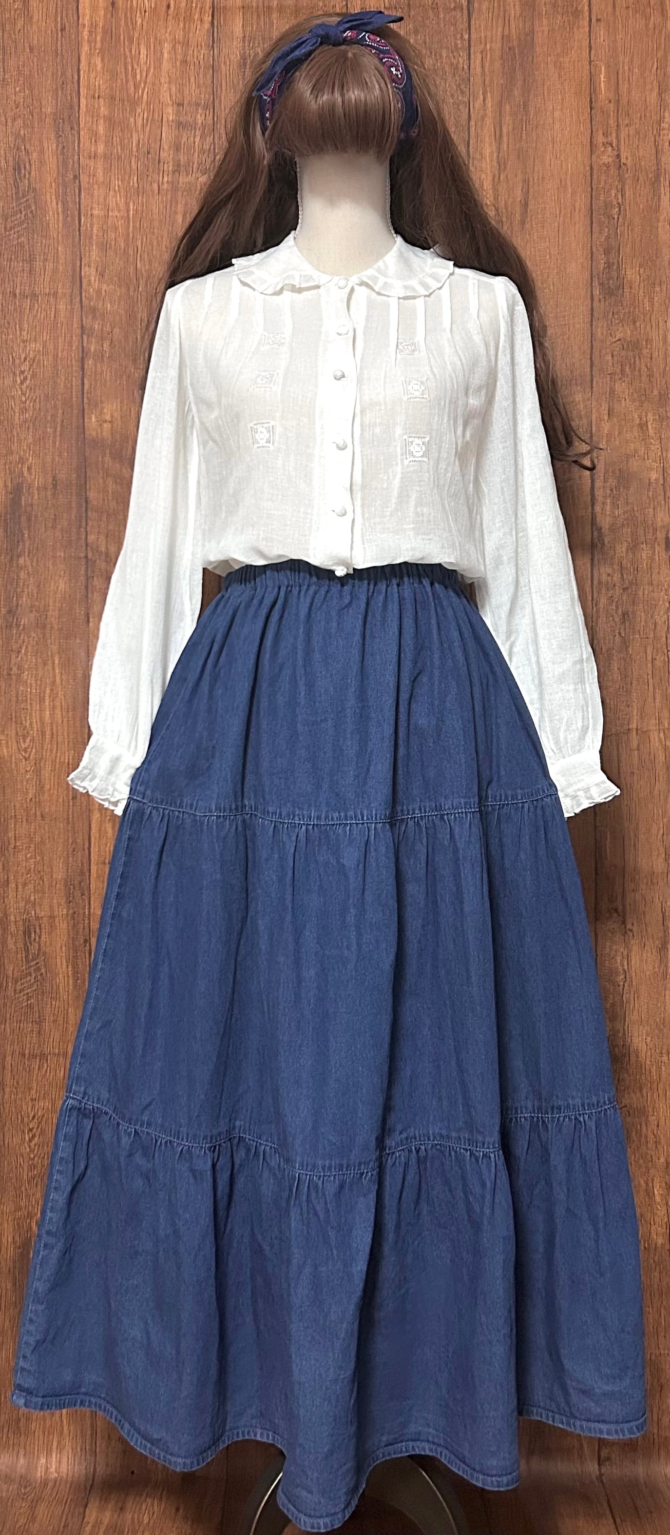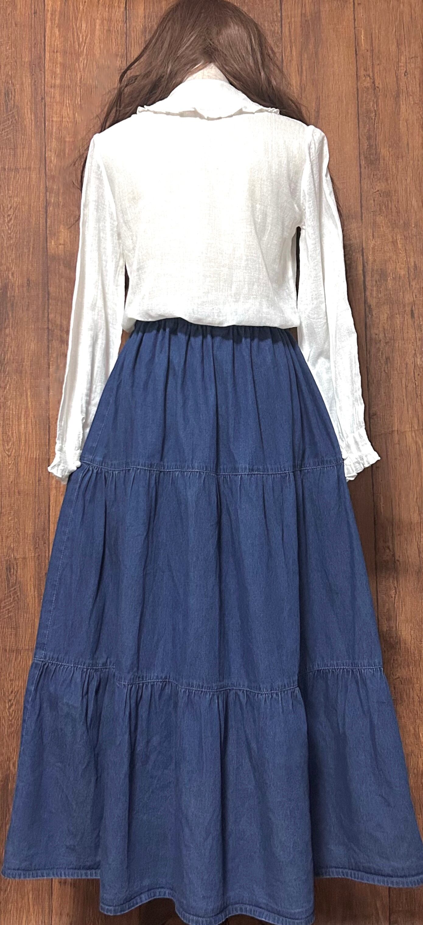 デニム ロング ティアード ボリューム スカート カントリー レトロ ガーリー おしゃれ かわいい 個性的 ヴィンテージ USA vintage used 古着/club723 クラブ723(N769)