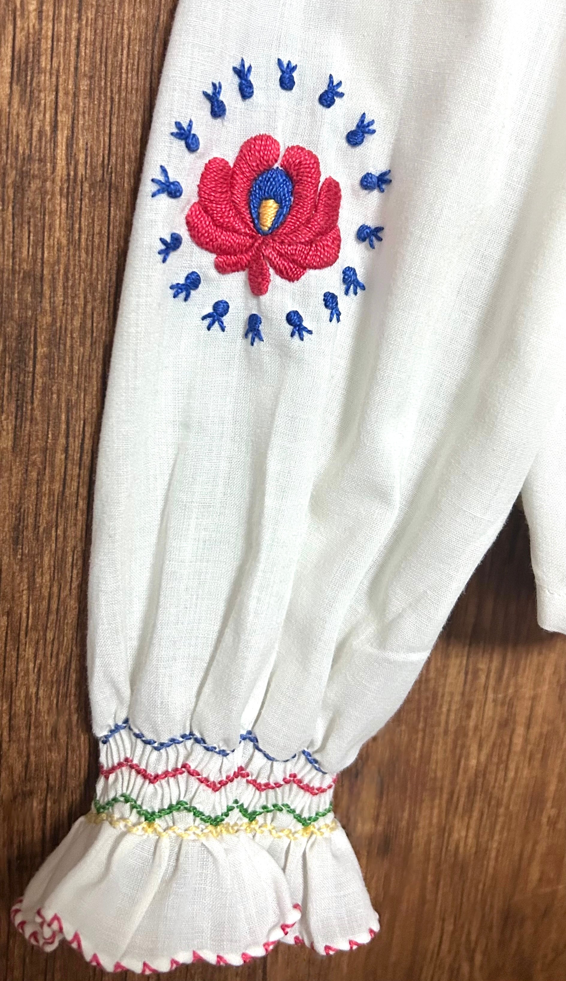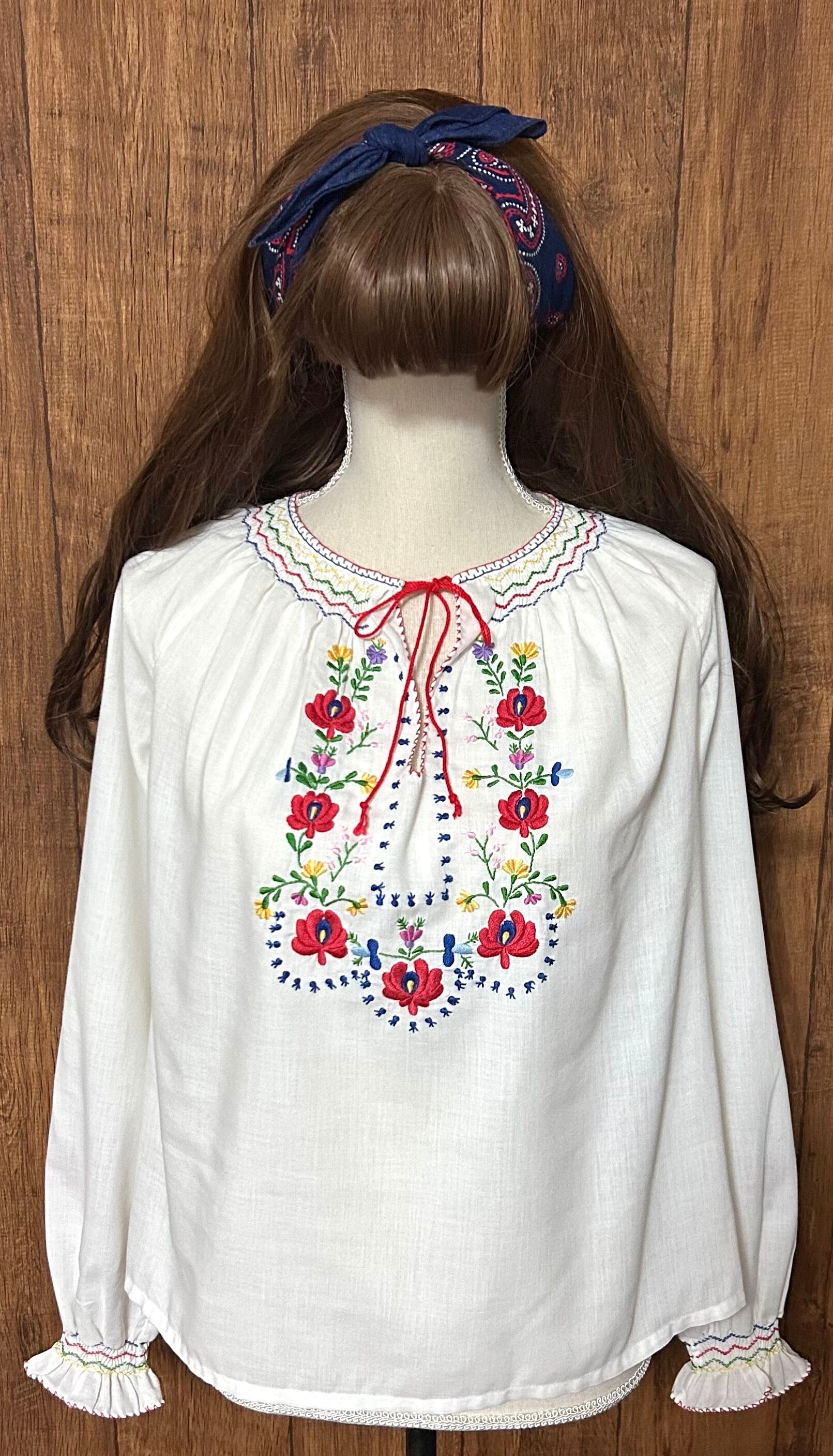 ハンガリー 刺繍 手刺繍 ブラウス マチョー 長袖 花 ヨーロッパ ヴィンテージ カラフル レトロ カントリー チロリアン フォーク スクエア ダンス かわいい 古着/club723 クラブ723(N773)
