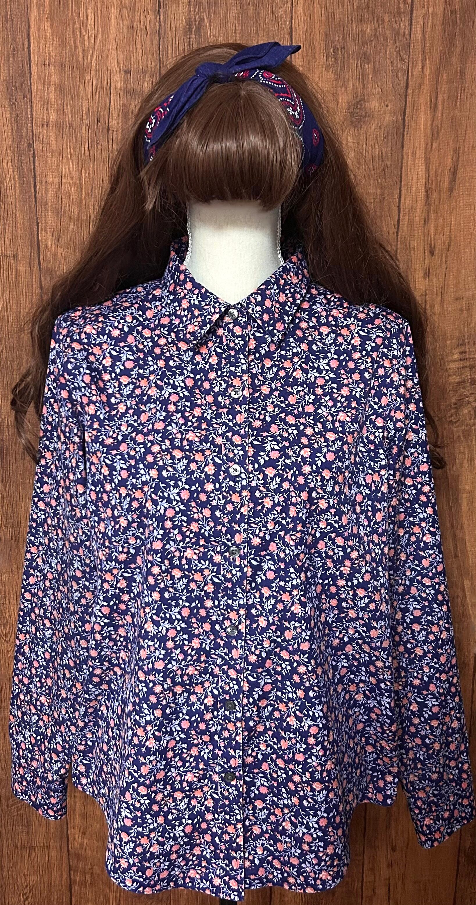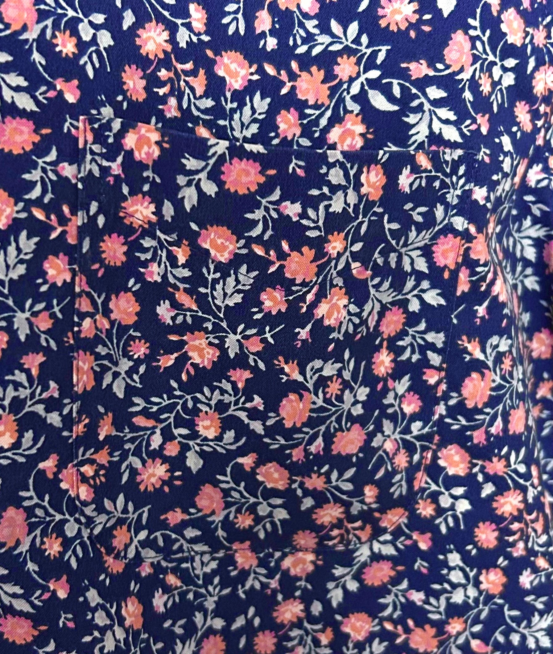 紺地×オレンジの小花柄がおしゃれな長袖シャツ。