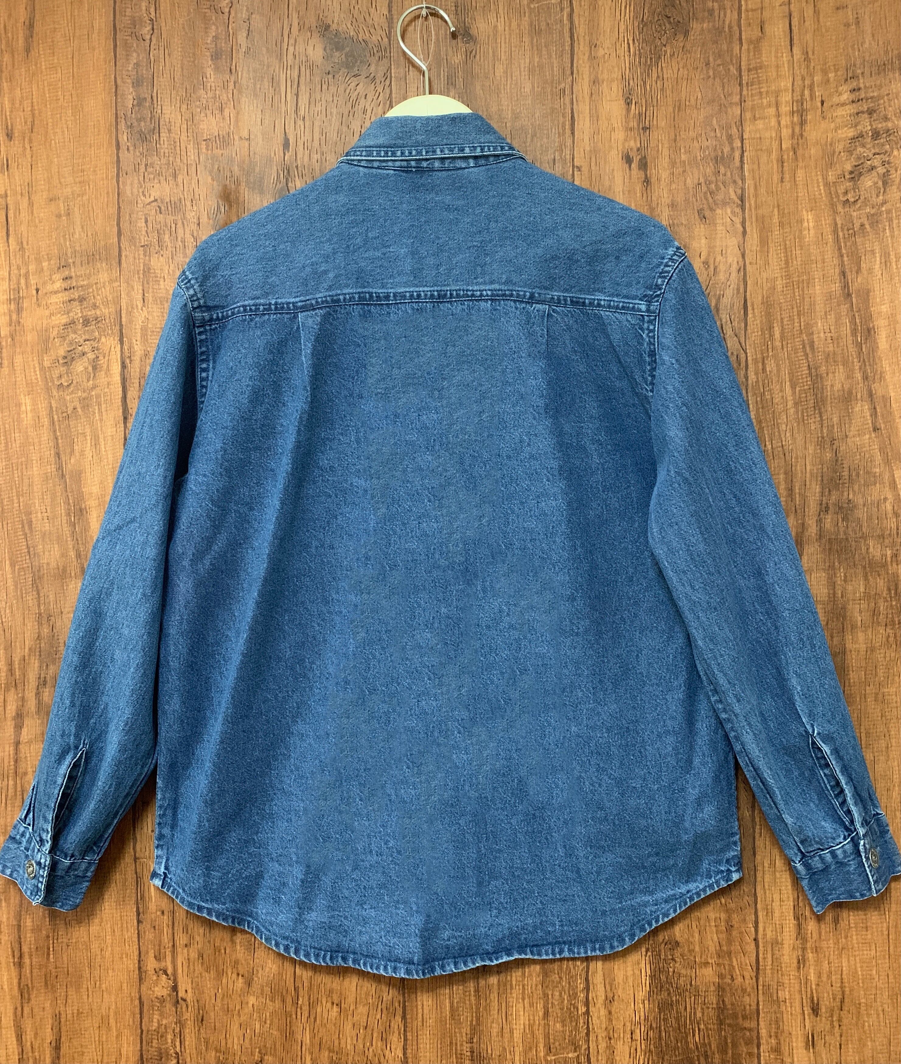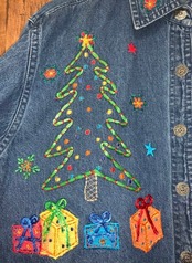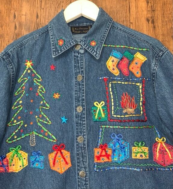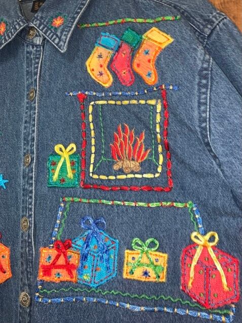 カラフル クリスマス デニム シャツ 刺繍 アップリケ ツリー プレゼント ヴィンテージ vintage used アメリカ USA 古着/club723 (N141)