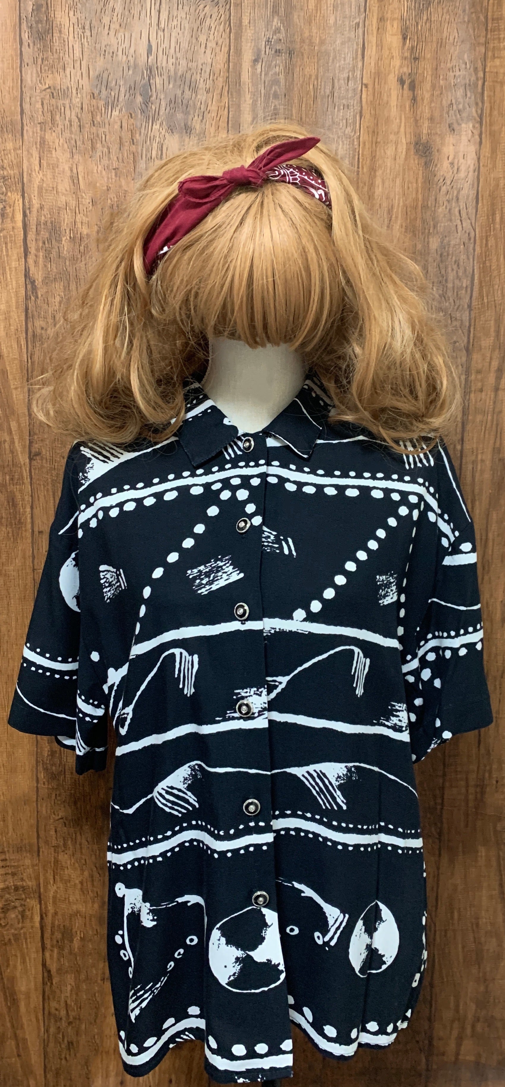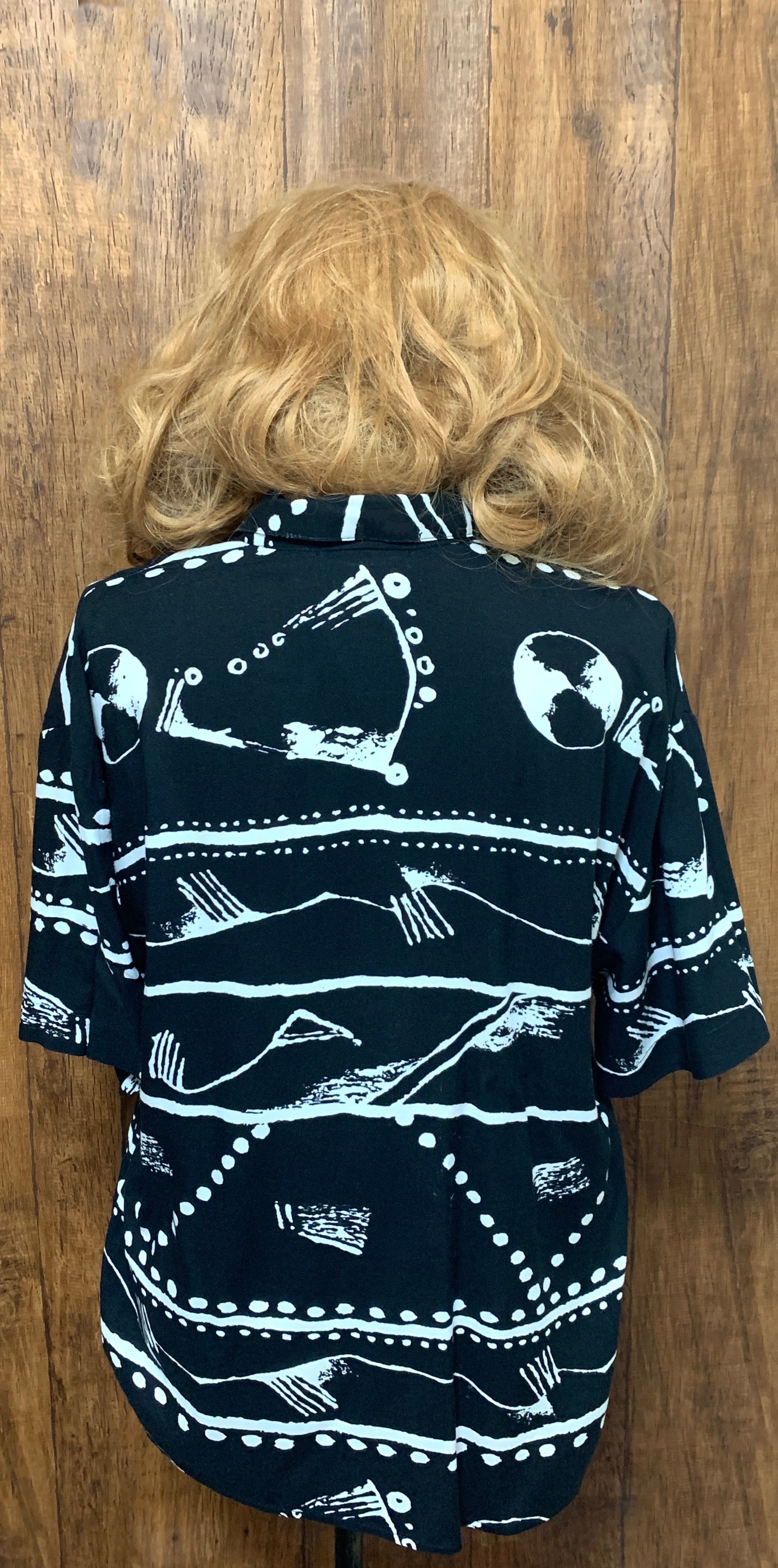 黒 白 モノトーン 半袖 シャツ ブラウス レーヨン テロテロ 個性的 アメリカン レトロ ロック USA ヴィンテージ vintage used ユーズド 古着/ club723(N316)