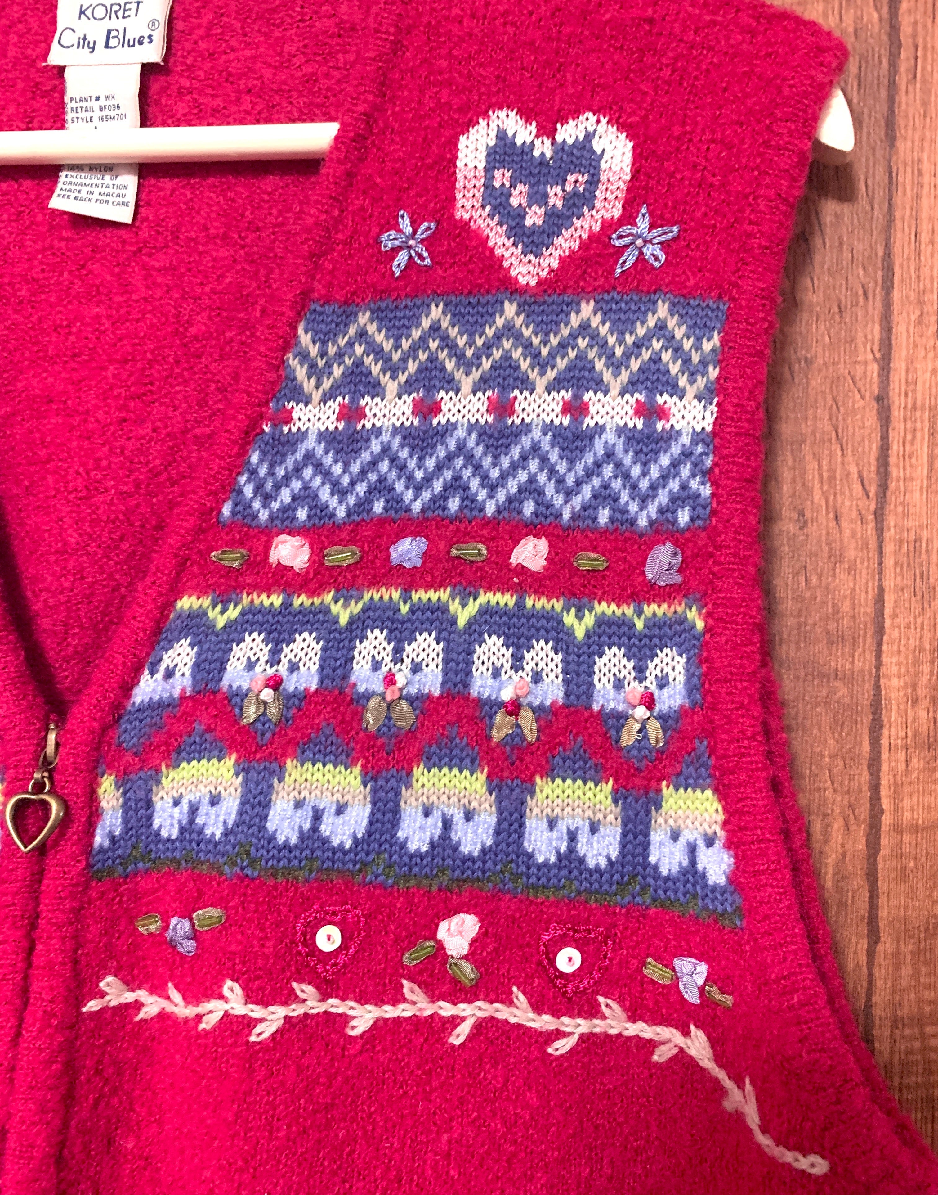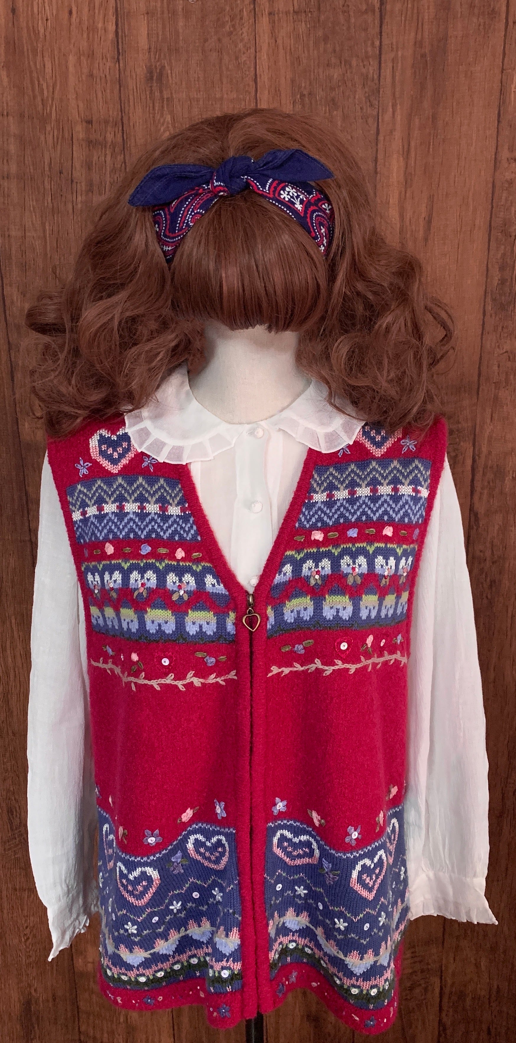 ニット ベスト ピンク 刺繍 手刺繍 装飾 ハート 花 ビジュー レトロ ヴィンテージ アメリカン カントリー 個性的 かわいい vintage used 古着/club723(N387)
