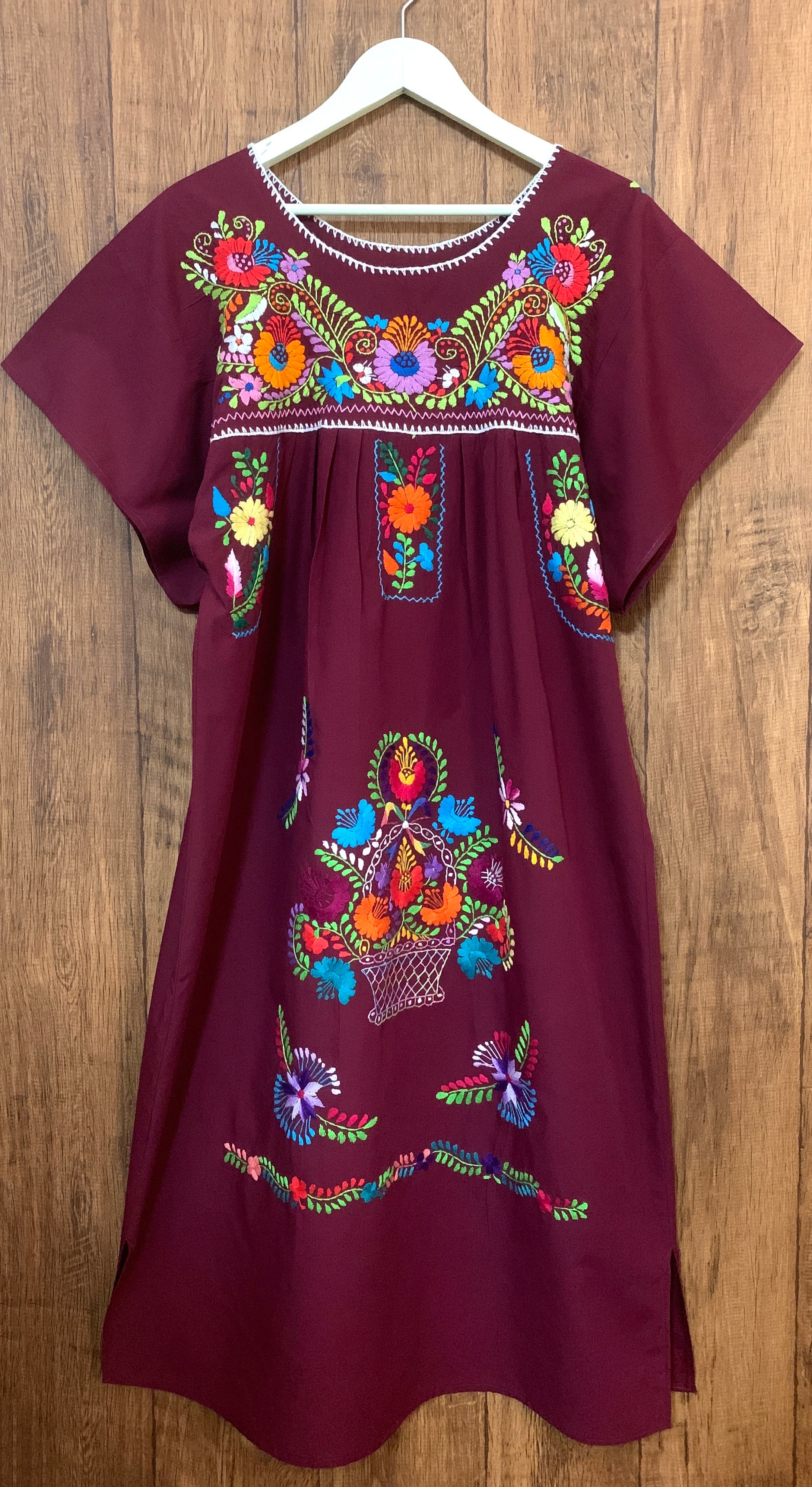 メキシカン ワンピース エスニック ヒッピー 花 刺繍 手刺繍 ハンドメイド カラフル エンジ ボルドー メキシコ USA ヴィンテージ vintage 古着/ club723 (N407)