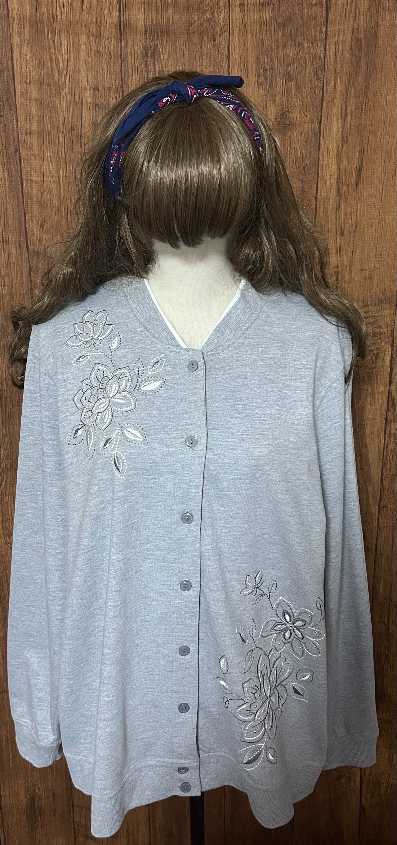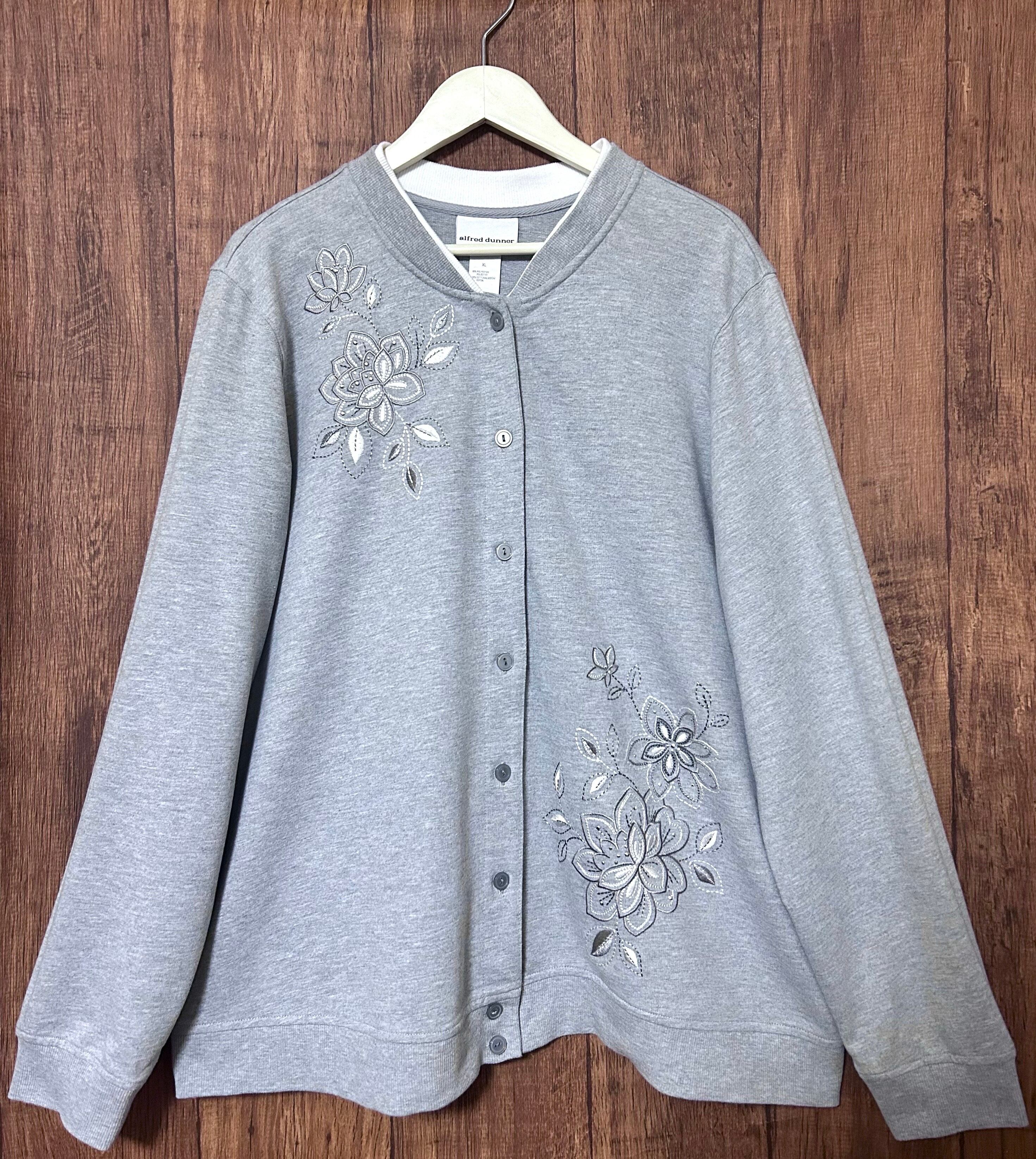刺繍 スウェット スエット カーディガン カーデ 花 グレー 薄グレー レトロ カントリー 個性的 おしゃれ かわいい USA vintage used 古着/club723(N463)