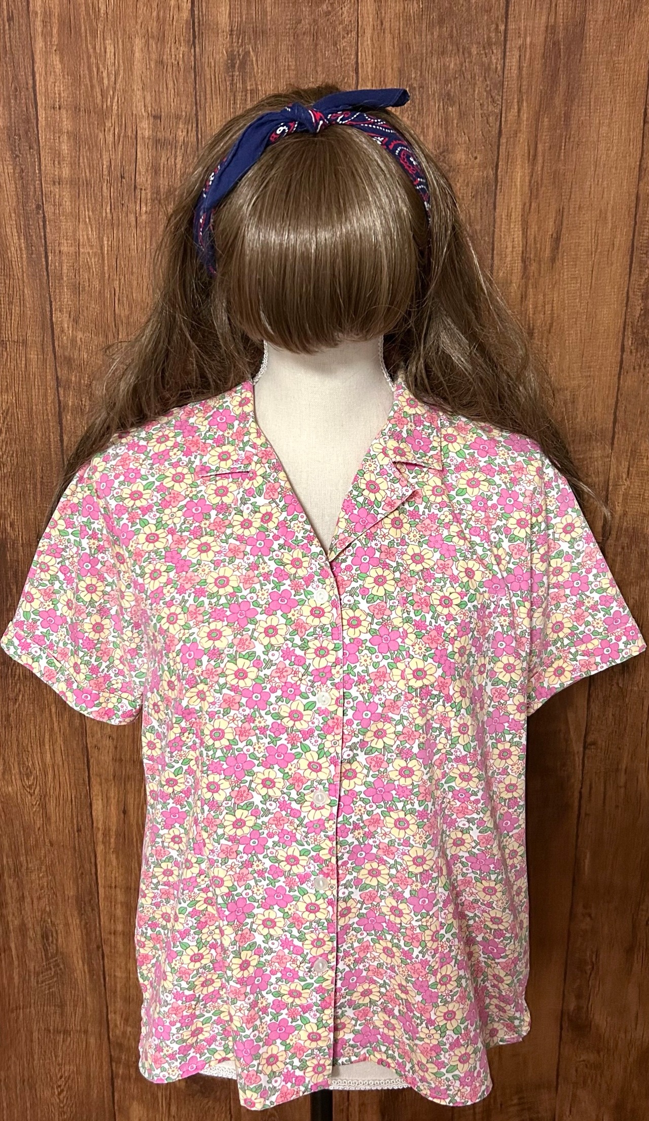 花 柄 シャツ 半袖 胸ポケット ピンク 黄色 カラフル レトロ ガーリー カントリー 個性的 おしゃれ かわいい USA ヴィンテージ used vintage 古着/club723(N512)