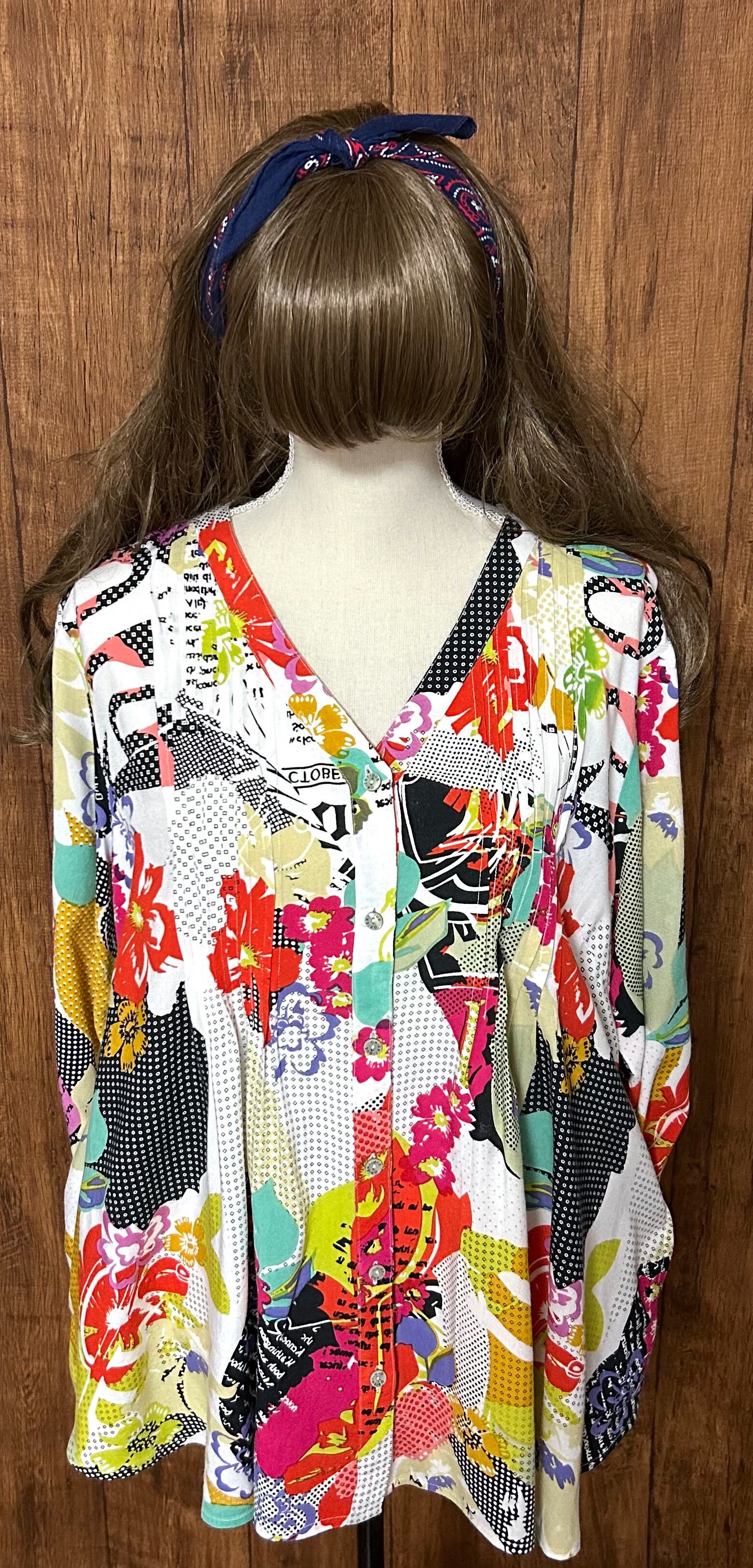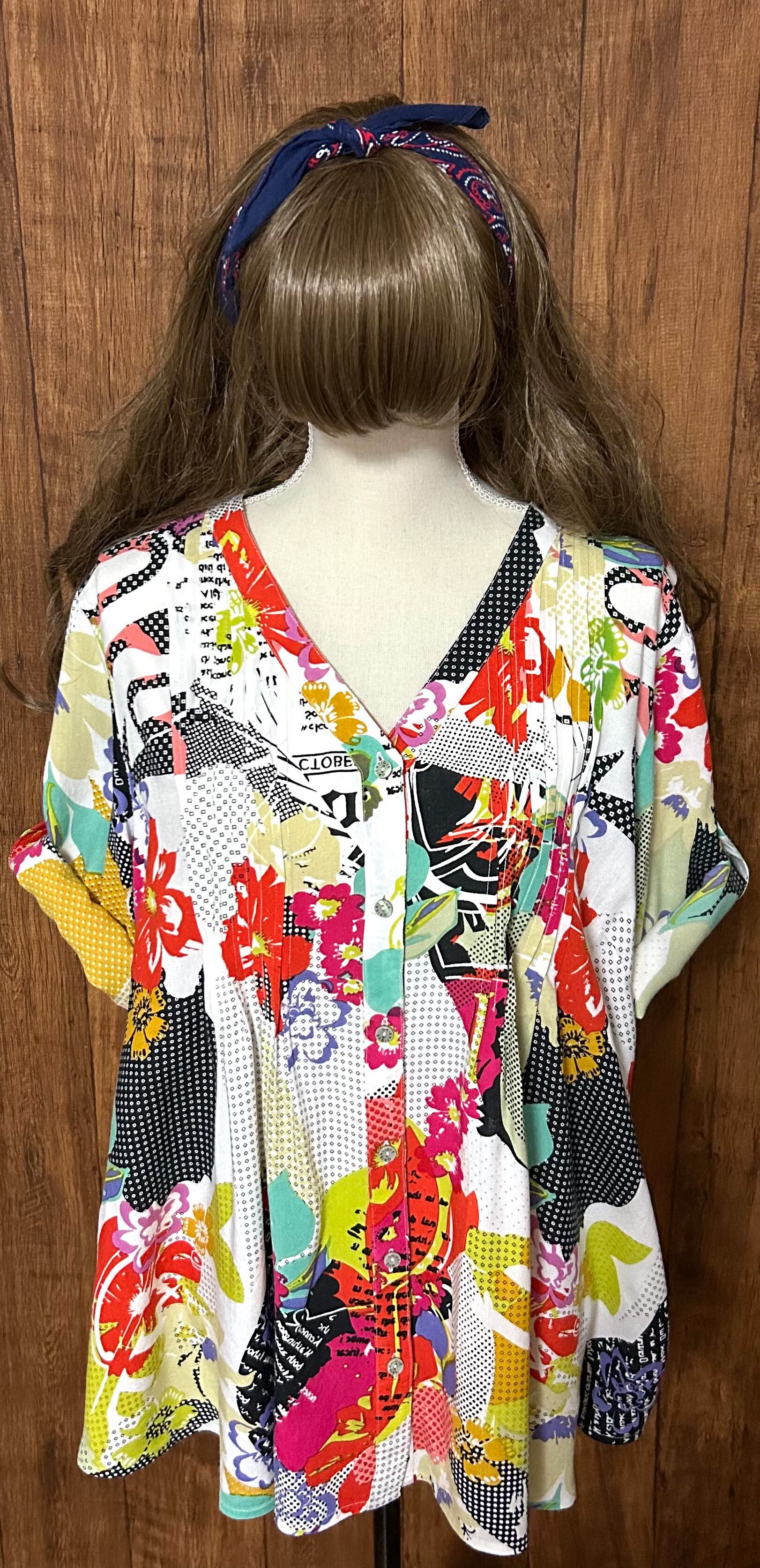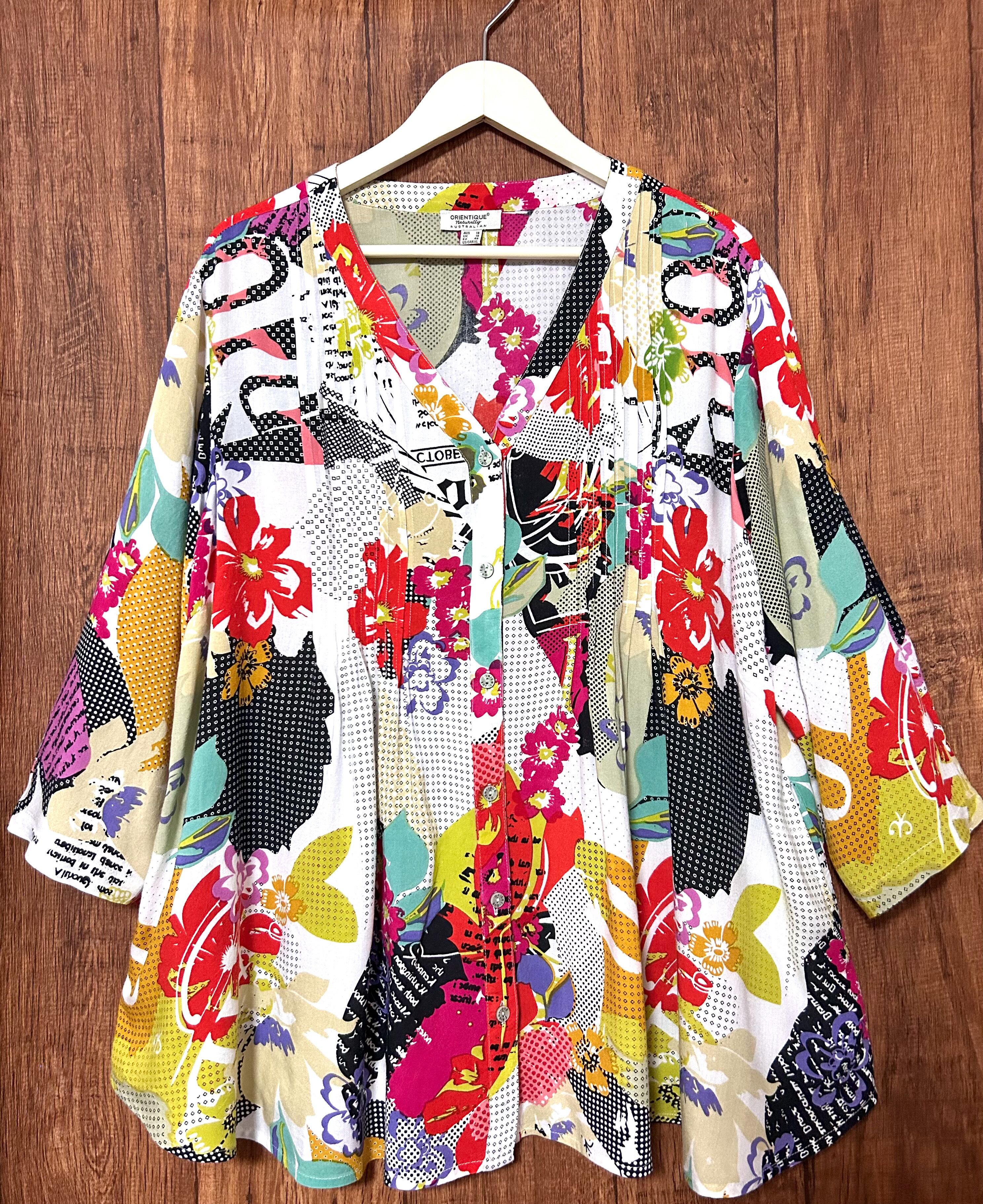 花 柄 シャツ 七分袖 半袖 Vネック ポケット カラフル レトロ カントリー ガーリー 個性的 おしゃれ かわいい ヴィンテージ used vintage 古着/club723(N530)