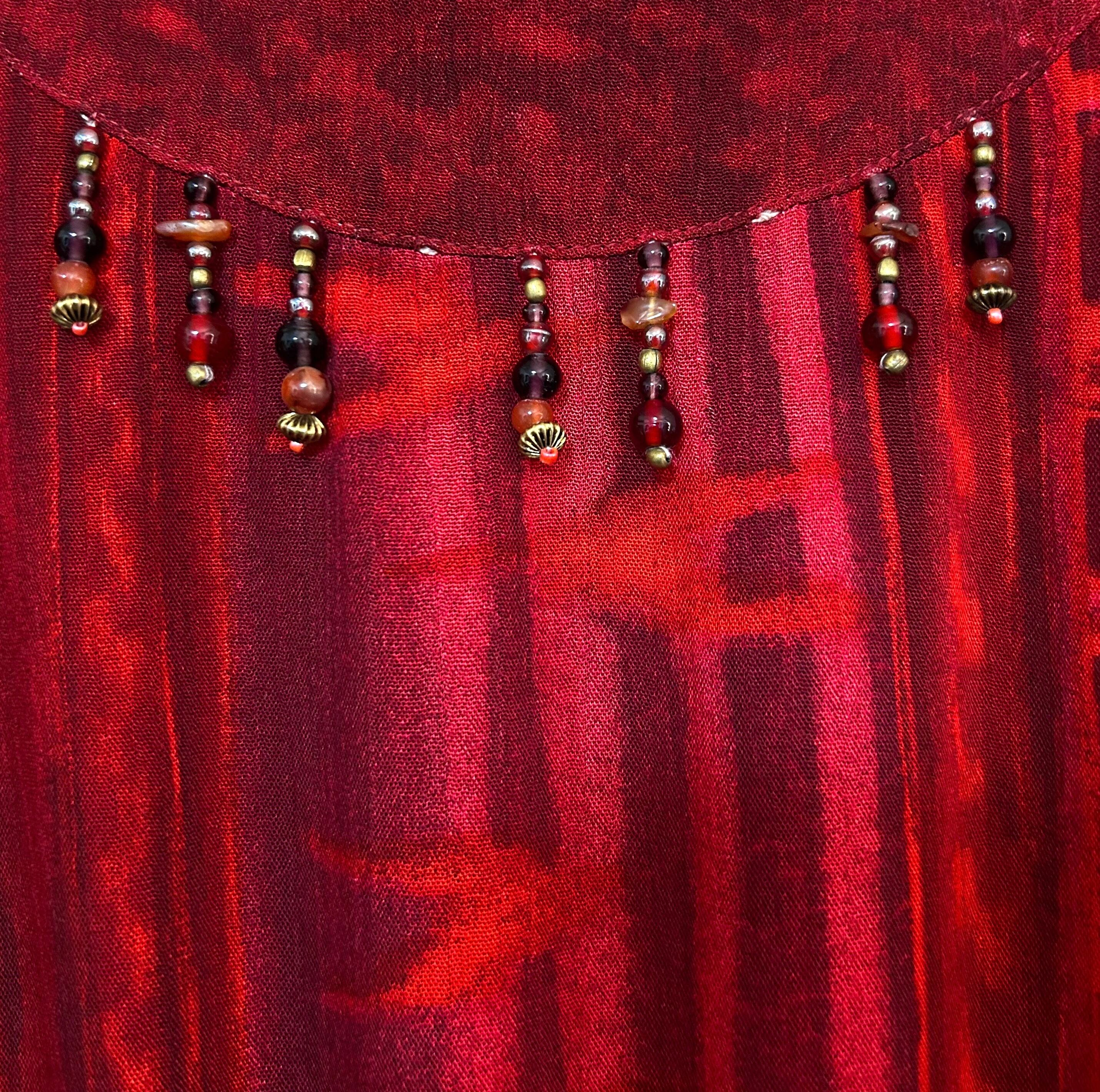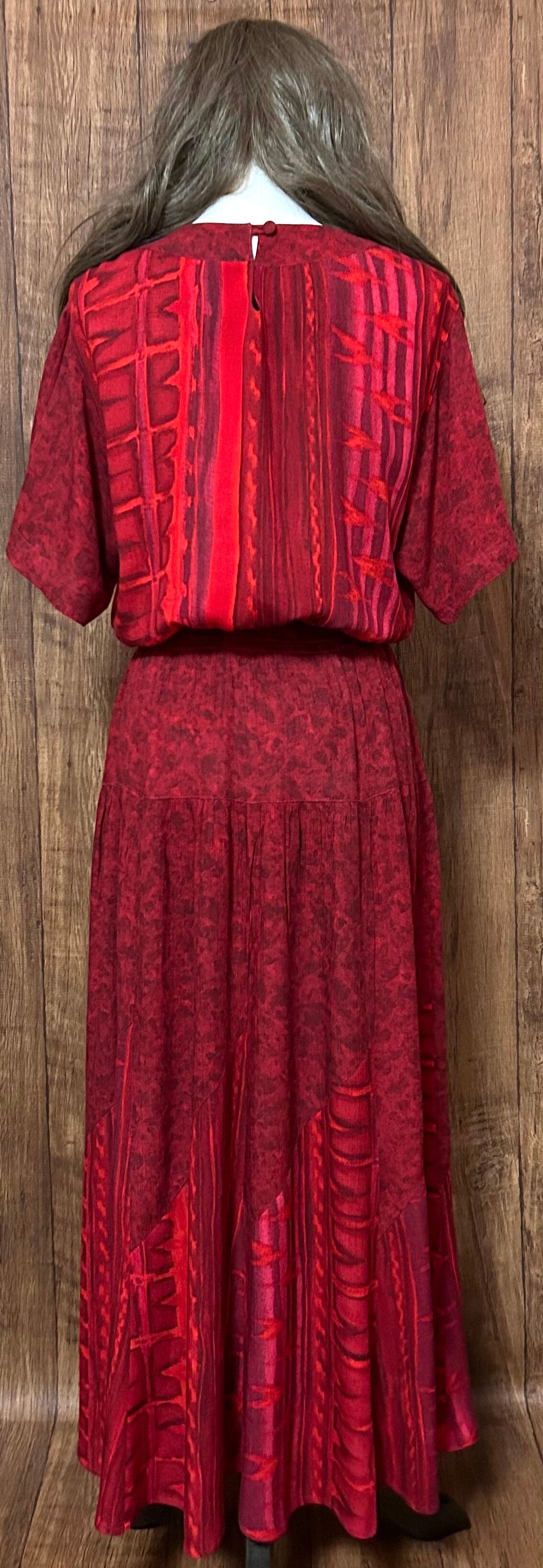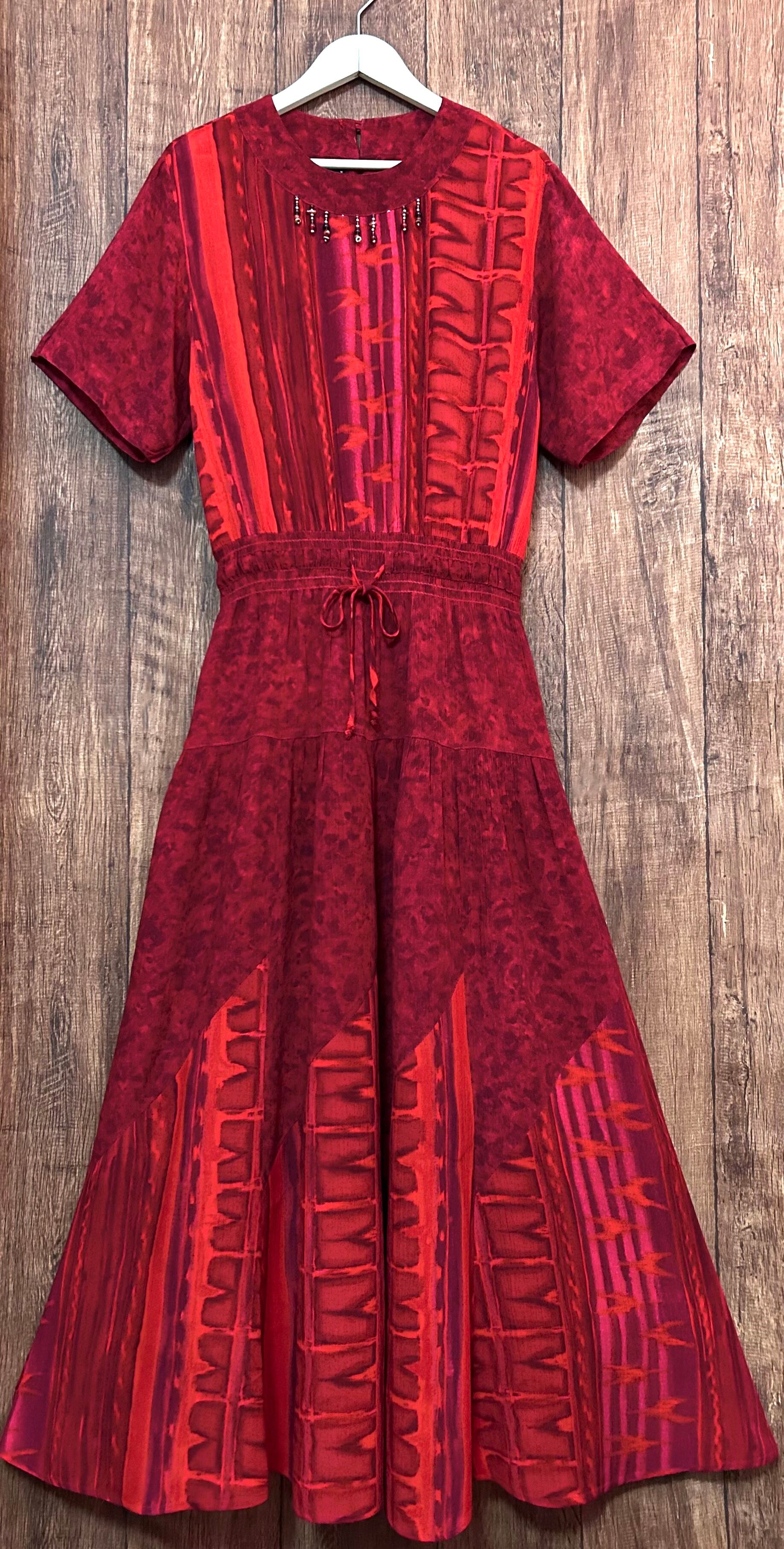 ヴィンテージ ロング マキシ ワンピース 赤 半袖 装飾 レーヨン レトロ カントリー エスニック 個性的 おしゃれ かわいい USA vintage used 古着/club723(N544)